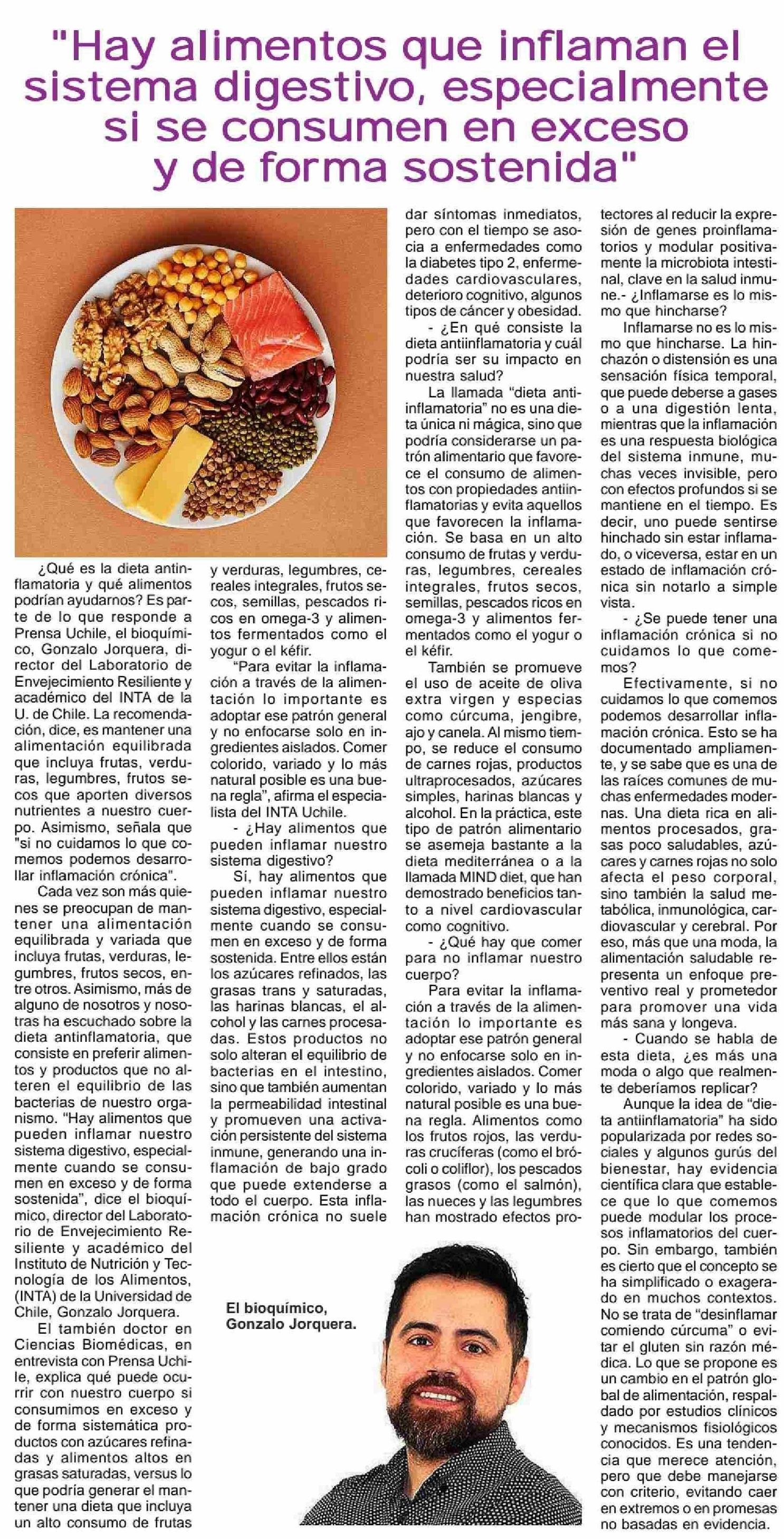 | Título: | "Hay alimentos que inflaman el sistema digestivo, especialmente si se consumen en exceso y de forma sostenida" |
