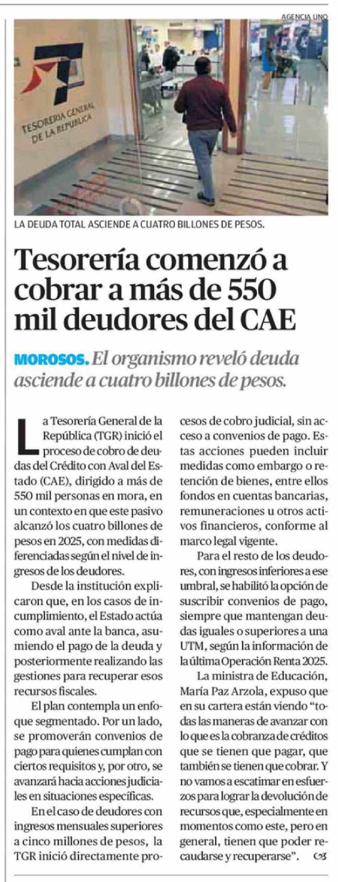 Tesorería comenzó a cobrar a más de 550 mil deudores del CAE 07-04-2026 El Mercurio de Calama |