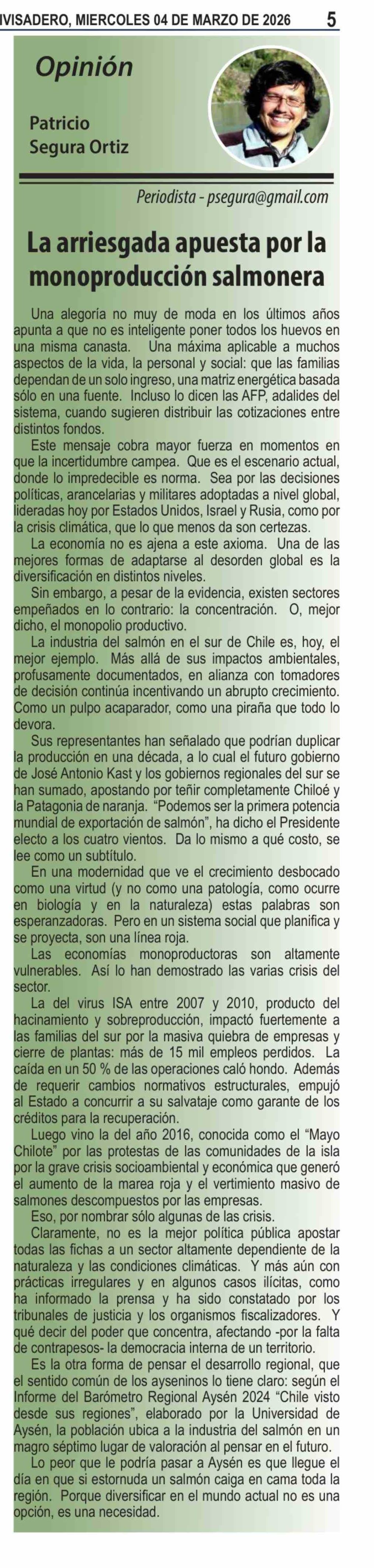 Columnas de Opinión: La arriesgada apuesta por la monoproducción salmonera 04-03-2026 El Divisadero |