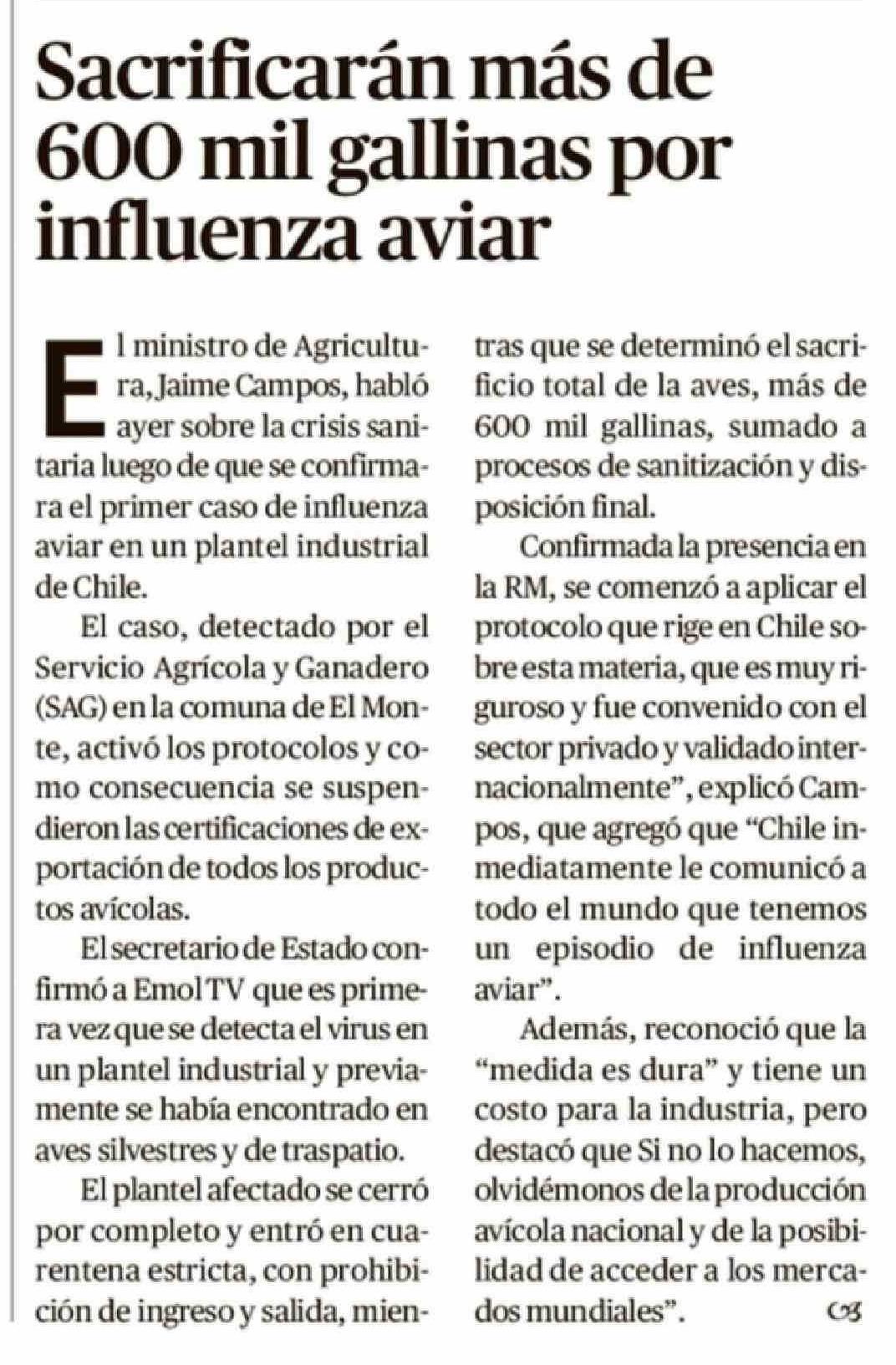 Sacrificarán más de 600 mil gallinas por influenza aviar 27-03-2026 El Austral de Osorno |