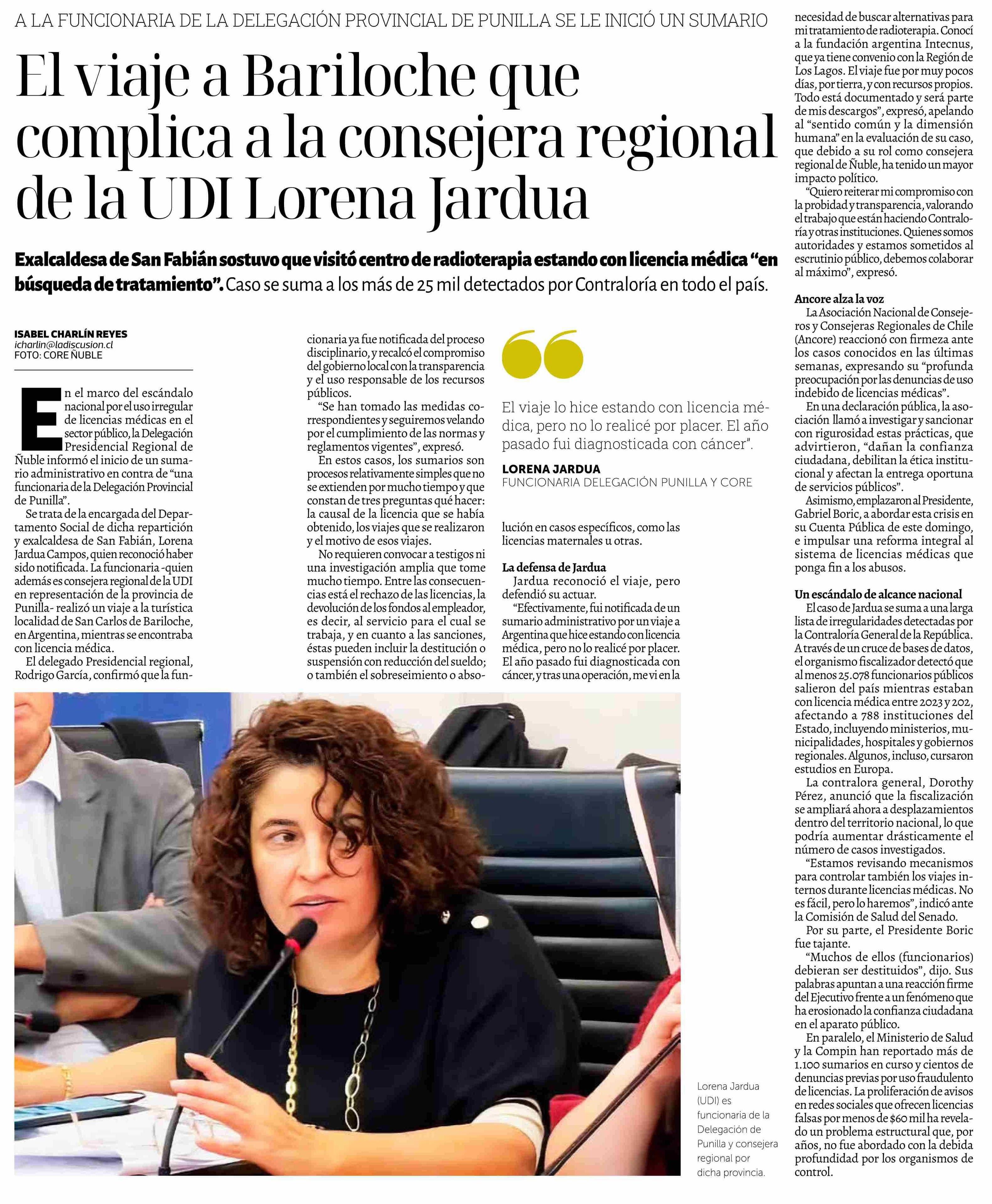 El viaje a Bariloche que complica a la consejera regional de la UDI Lorena Jardua 30-05-2025 La Discusión |