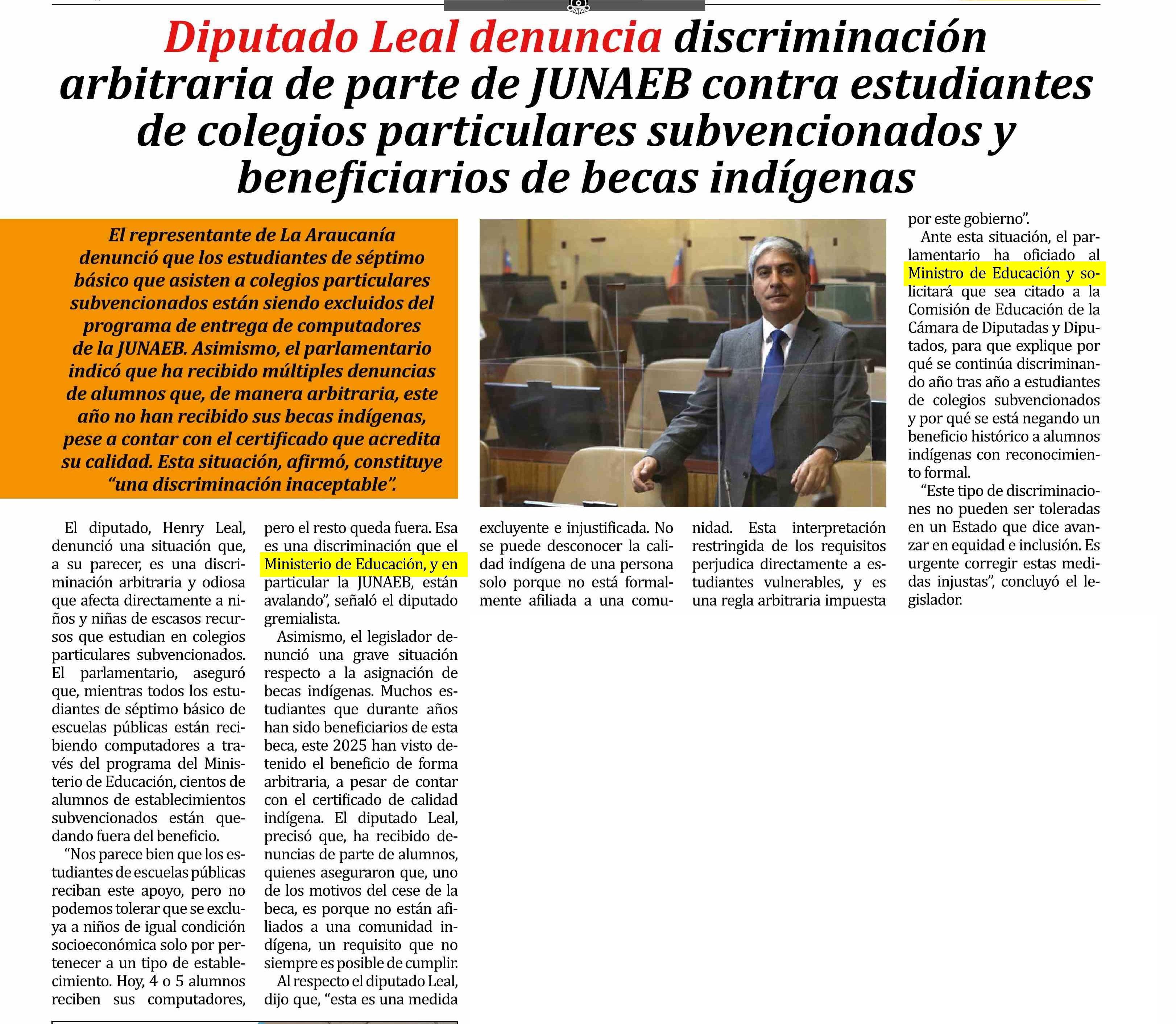 Diputado Leal! denuncia discriminación arbitraria de parte de JUNAEB contra estudiantes de colegios particulares subvencionados y beneficiarios de becas indígenas 17-06-2025 Las Noticias |