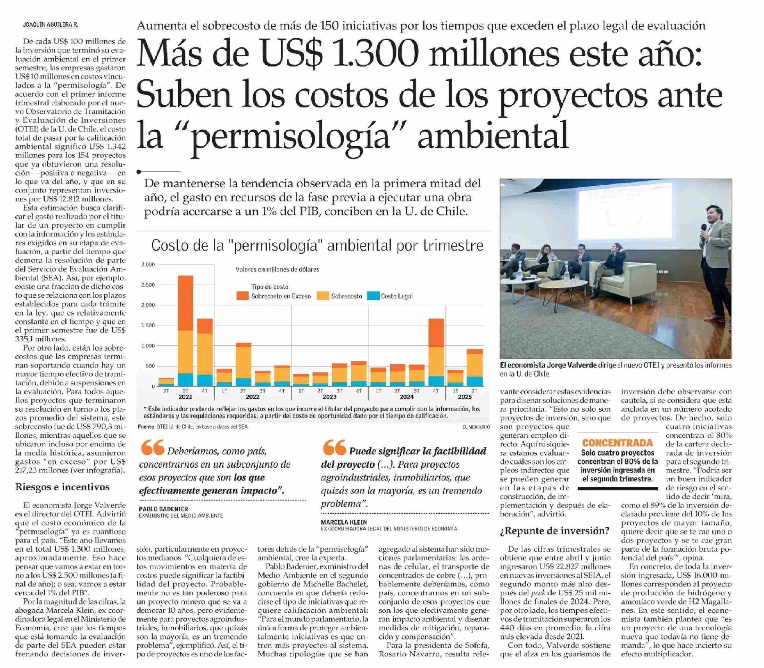 Más de US$ 1.300 millones este año: Suben los costos de los proyectos ante la “permisología” ambiental 07-08-2025 El Mercurio |