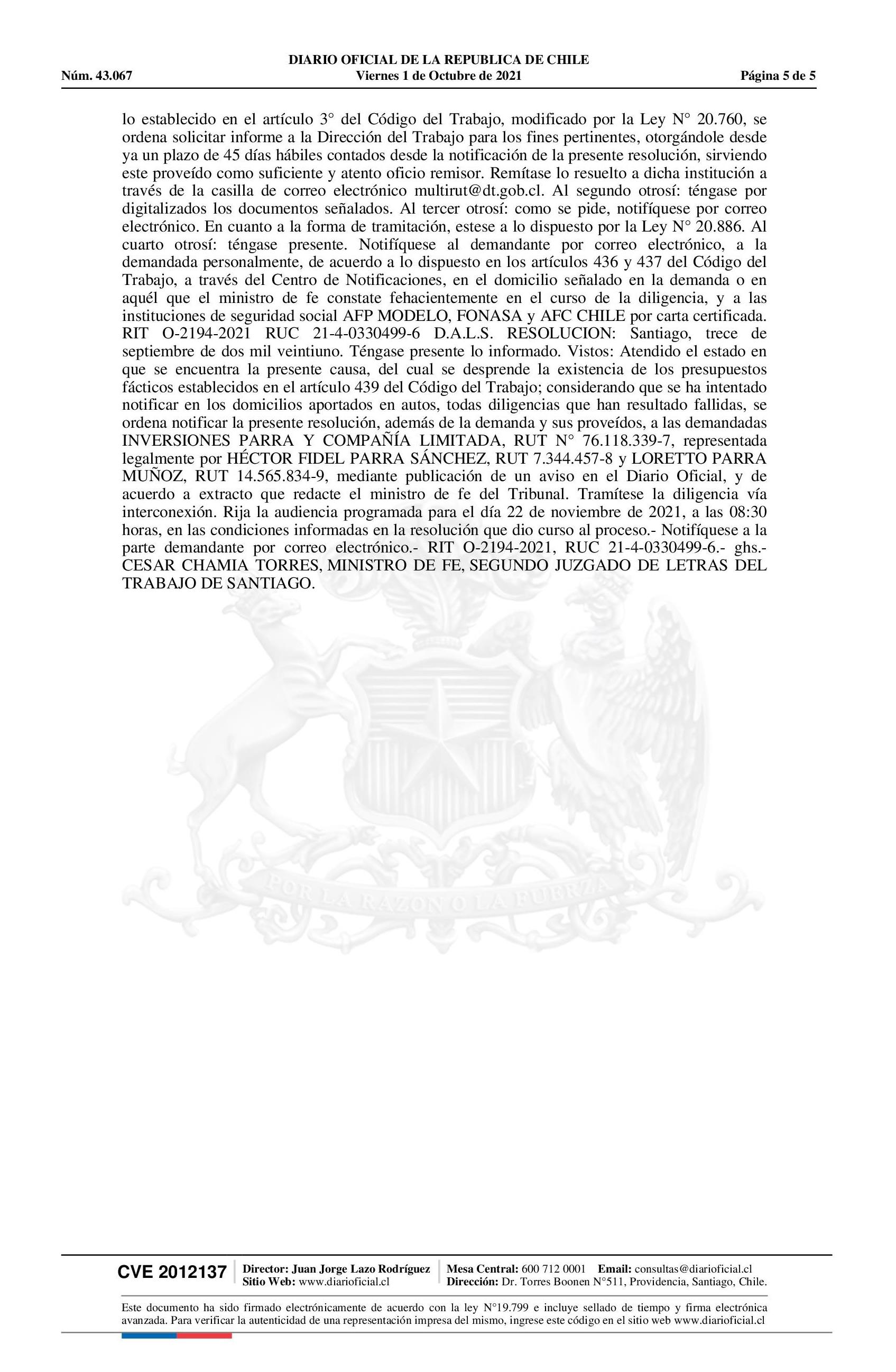 Notificación 01-10-2021 Diario Oficial Edición Electrónica |