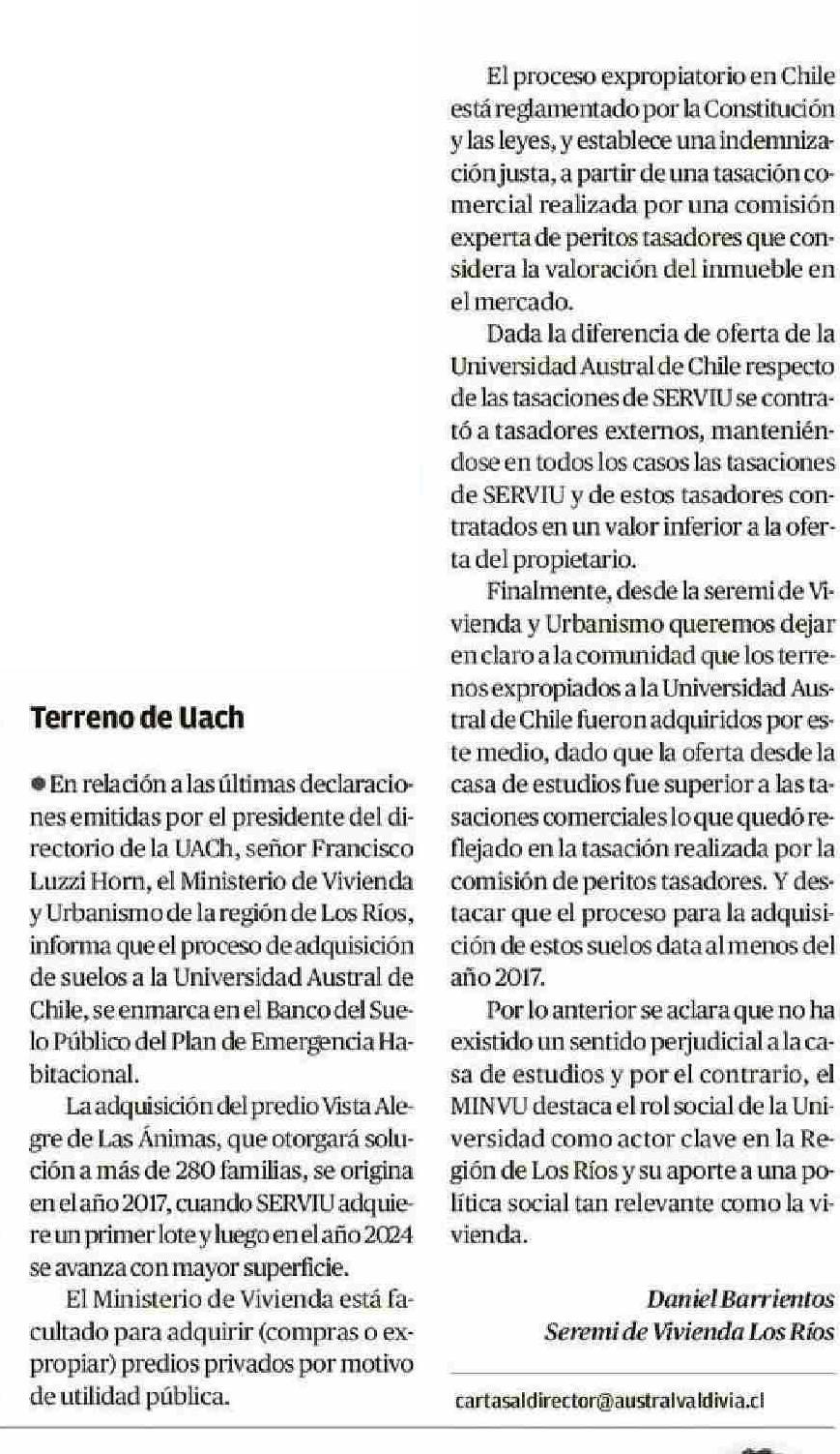 CARTAS: Terreno de Uach 15-06-2025 Diario Austral Región de Los Ríos |