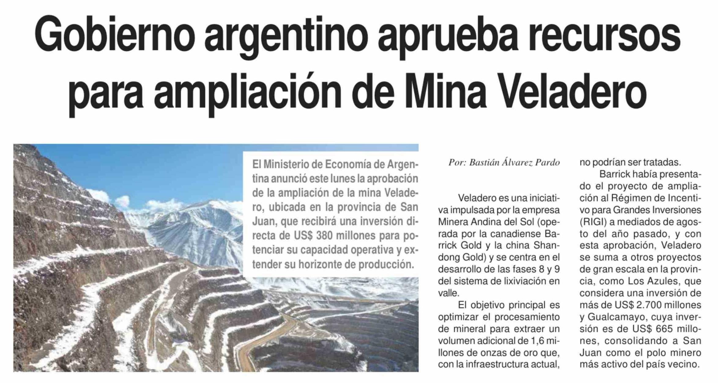 | Título: | Gobierno argentino aprueba recursos para ampliación de Mina Veladero |