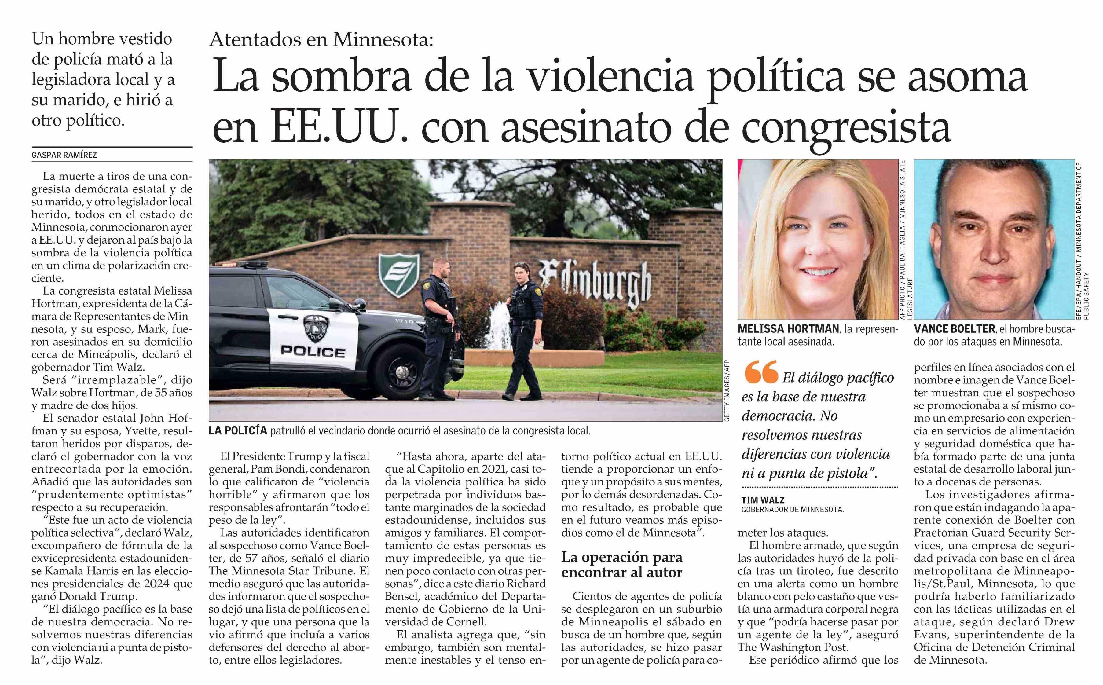 La sombra de la violencia política se asoma en EE.UU. con asesinato de congresista 15-06-2025 El Mercurio |