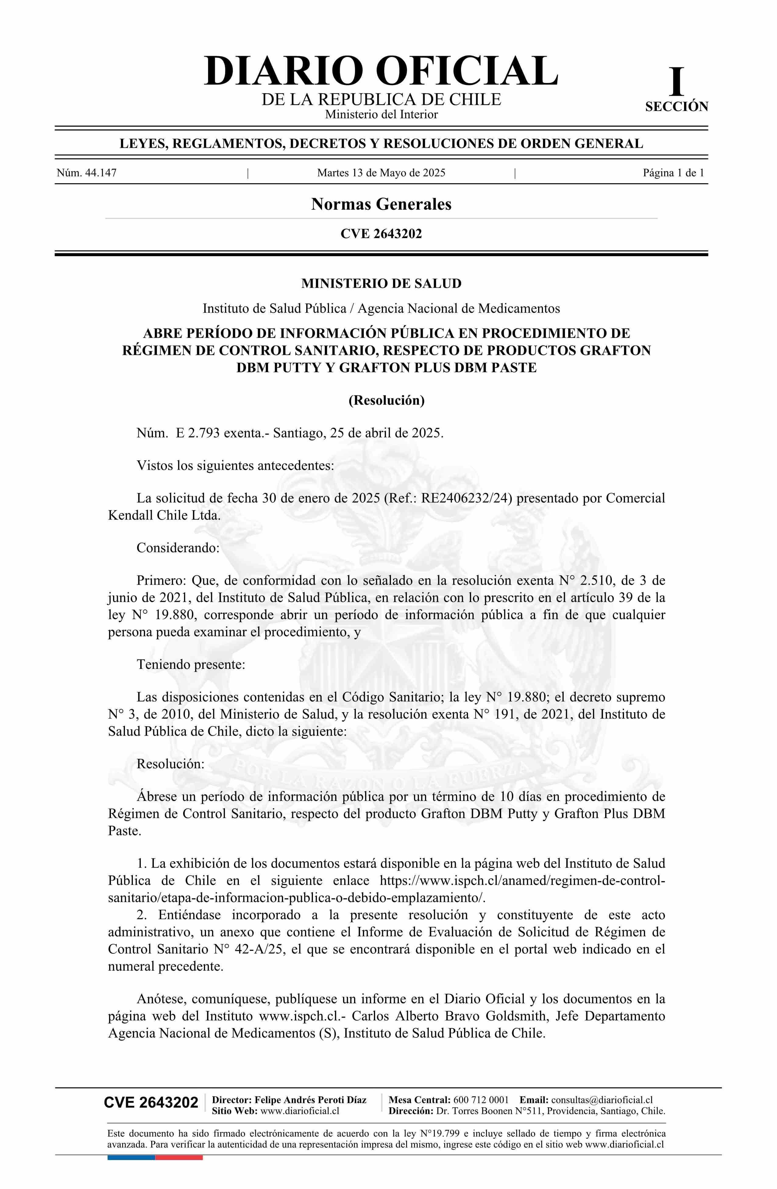 | Título: | Resolución exenta número E 2.793, de 2025.- Abre período de información pública en procedimiento de Régimen de Control Sanitario, respecto de productos Grafton DBM Putty y Grafton Plus DBM Paste |