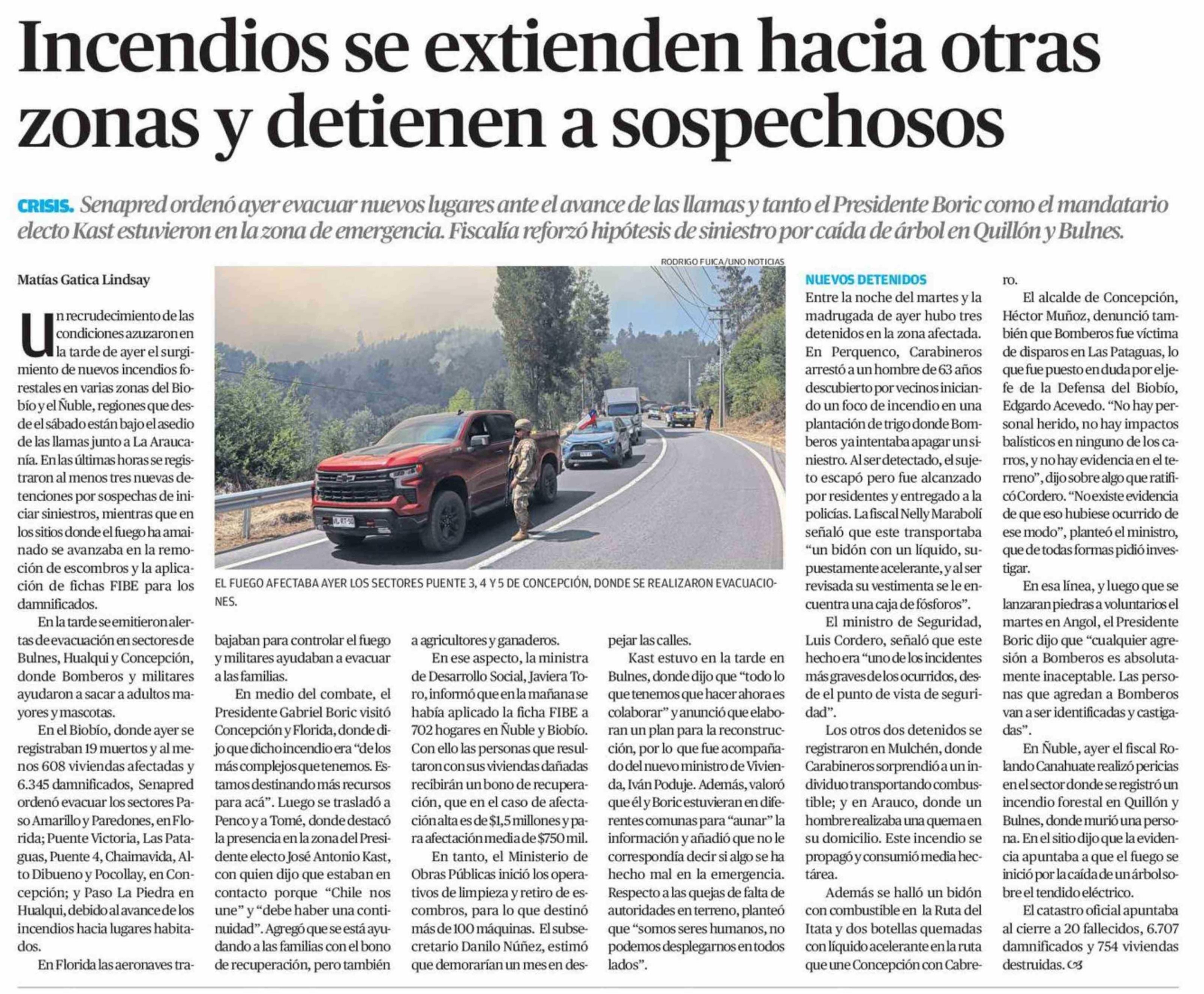 Incendios se extienden hacia otras zonas y detienen a sospechosos 22-01-2026 El Mercurio de Antofagasta |