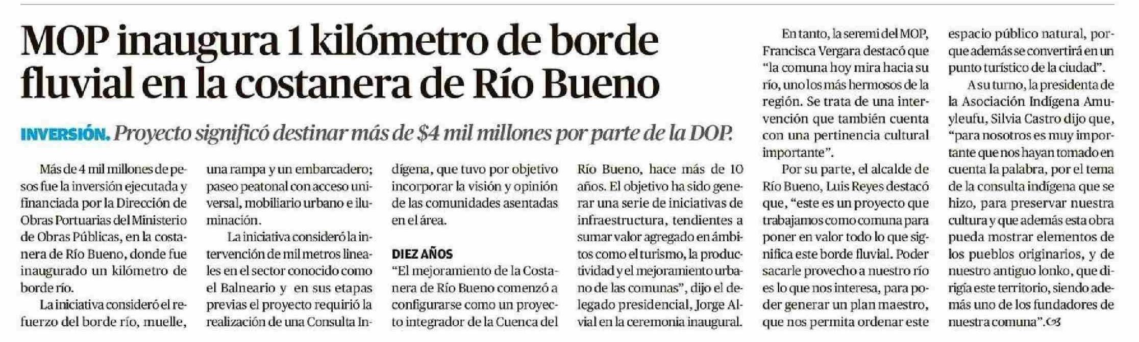 MOP inaugura 1 kilómetro de borde fluvial en la costanera de Río Bueno 26-01-2026 Diario Austral Región de Los Ríos |