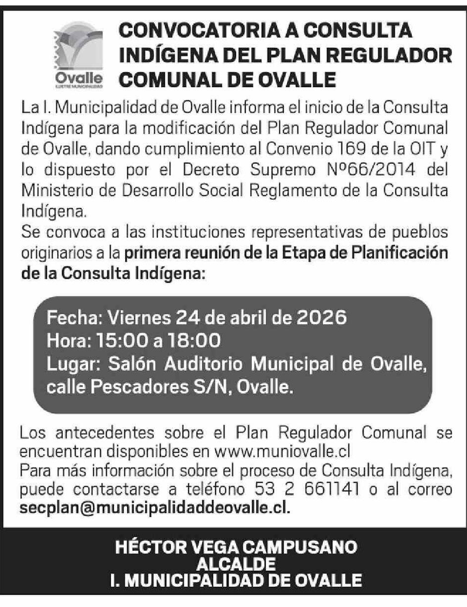 Extractos: CONVOCATORIA A CONSULTA INDÍGENA DEL PLAN REGULADOR COMUNAL DE OVALLE