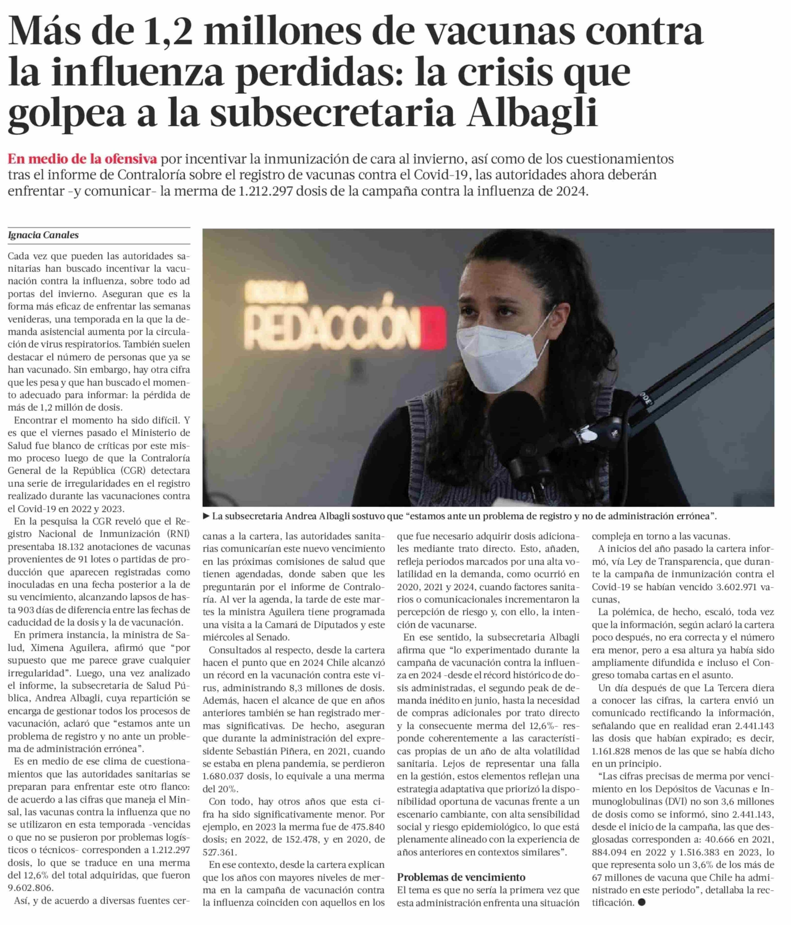 Más de 1,2 millones de vacunas contra la influenza perdidas: la crisis que golpea a la subsecretaria Albagli 14-05-2025 La Tercera |