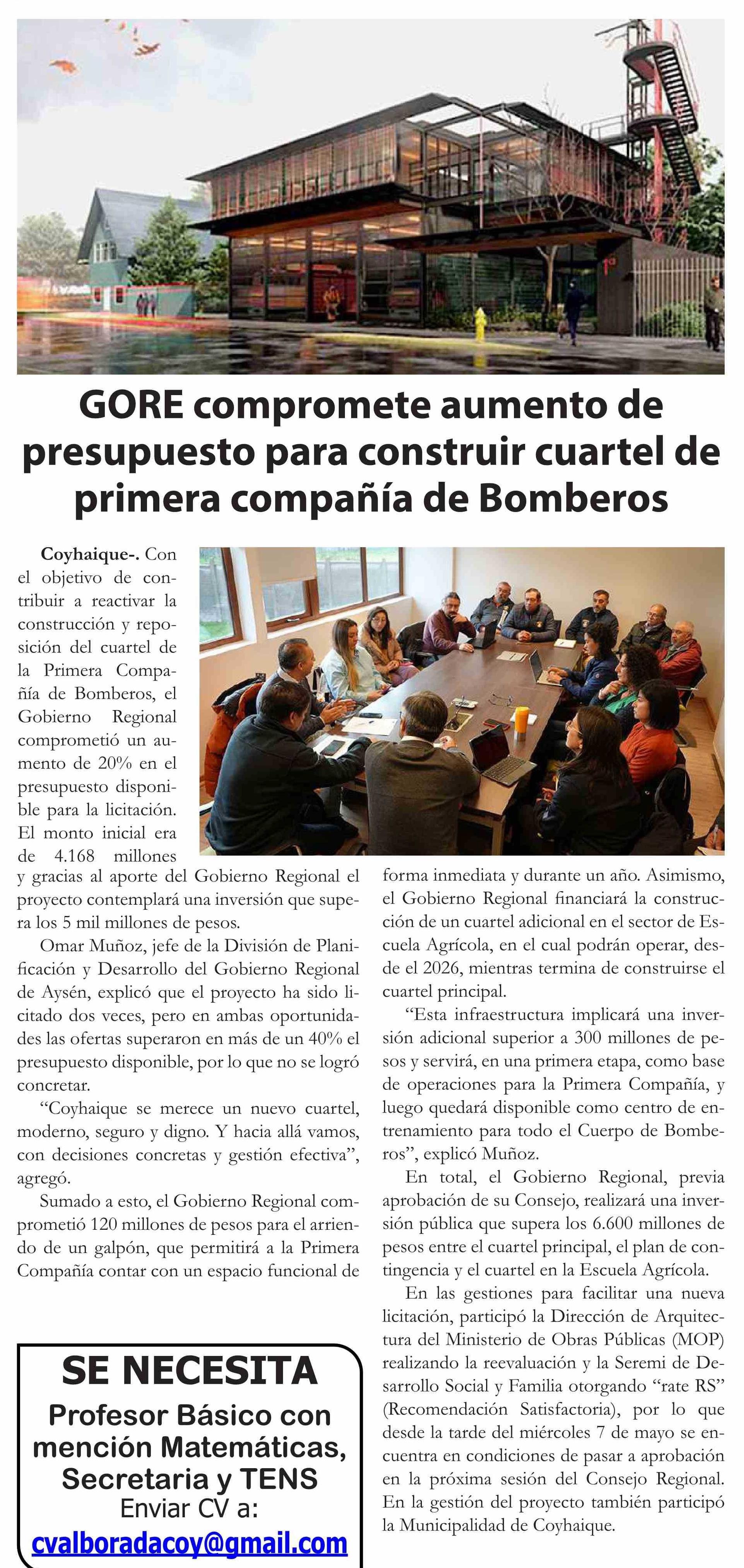 GORE compromete aumento de presupuesto para construir cuartel de primera compañía de Bomberos 09-05-2025 El Divisadero |