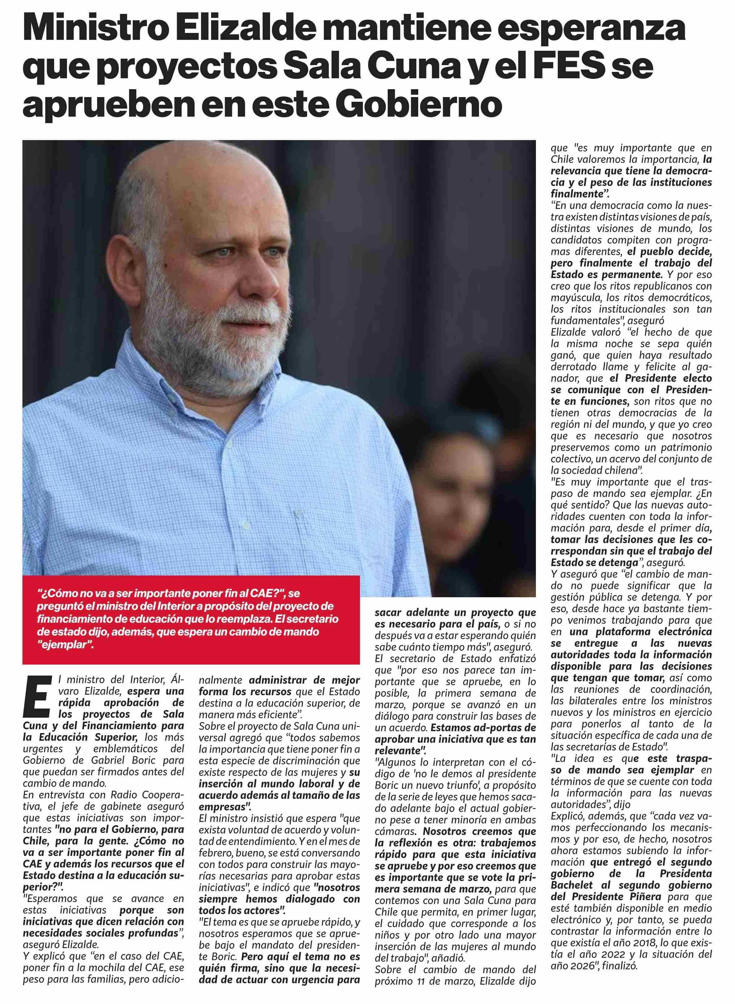 Ministro Elizalde mantiene esperanza que proyectos Sala Cuna y el FES se aprueben en este Gobierno 09-02-2026 Puranoticia.cl |