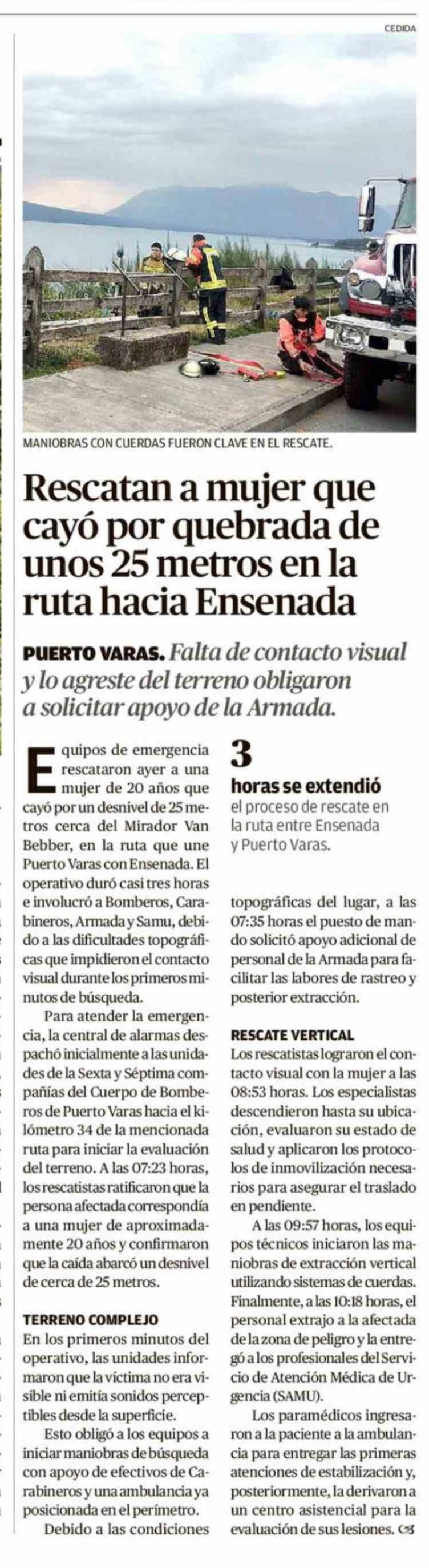 Rescatan a mujer que cayó por quebrada de unos 25 metros en la ruta hacia Ensenada 14-03-2026 El Llanquihue |