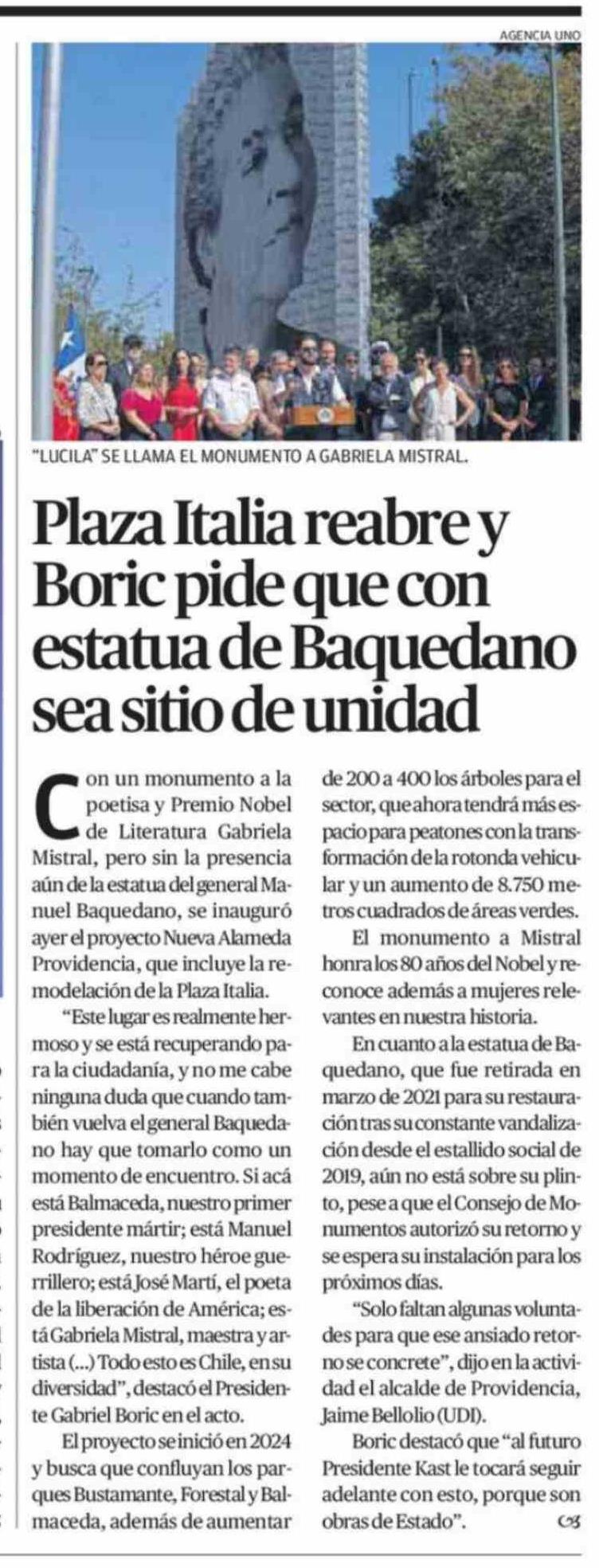 Plaza Italia reabre y Boric pide que con estatua de Baquedano sea sitio de unidad 06-03-2026 El Mercurio de Calama |