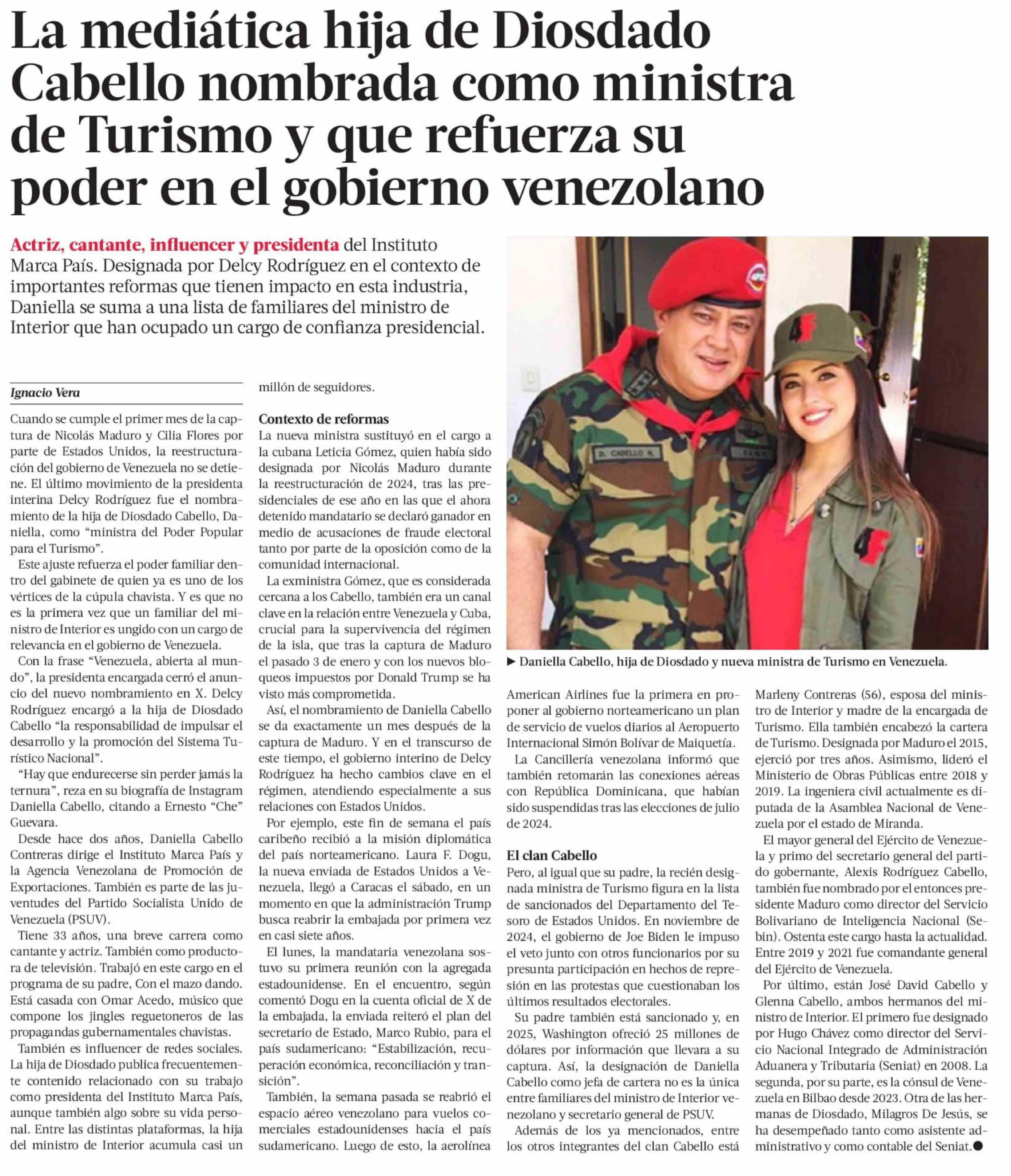La mediática hija de Diosdado Cabello nombrada como ministra de Turismo y que refuerza su poder en el gobierno venezolano 04-02-2026 La Tercera |