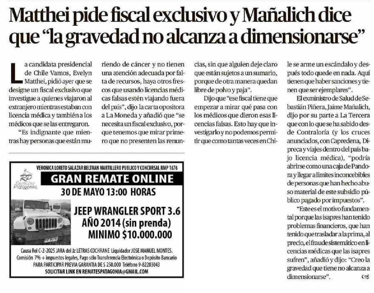 Matthei pide fiscal exclusivo y Mañalich dice que “la gravedad no alcanza a dimensionarse” 28-05-2025 El Austral de la Araucanía |