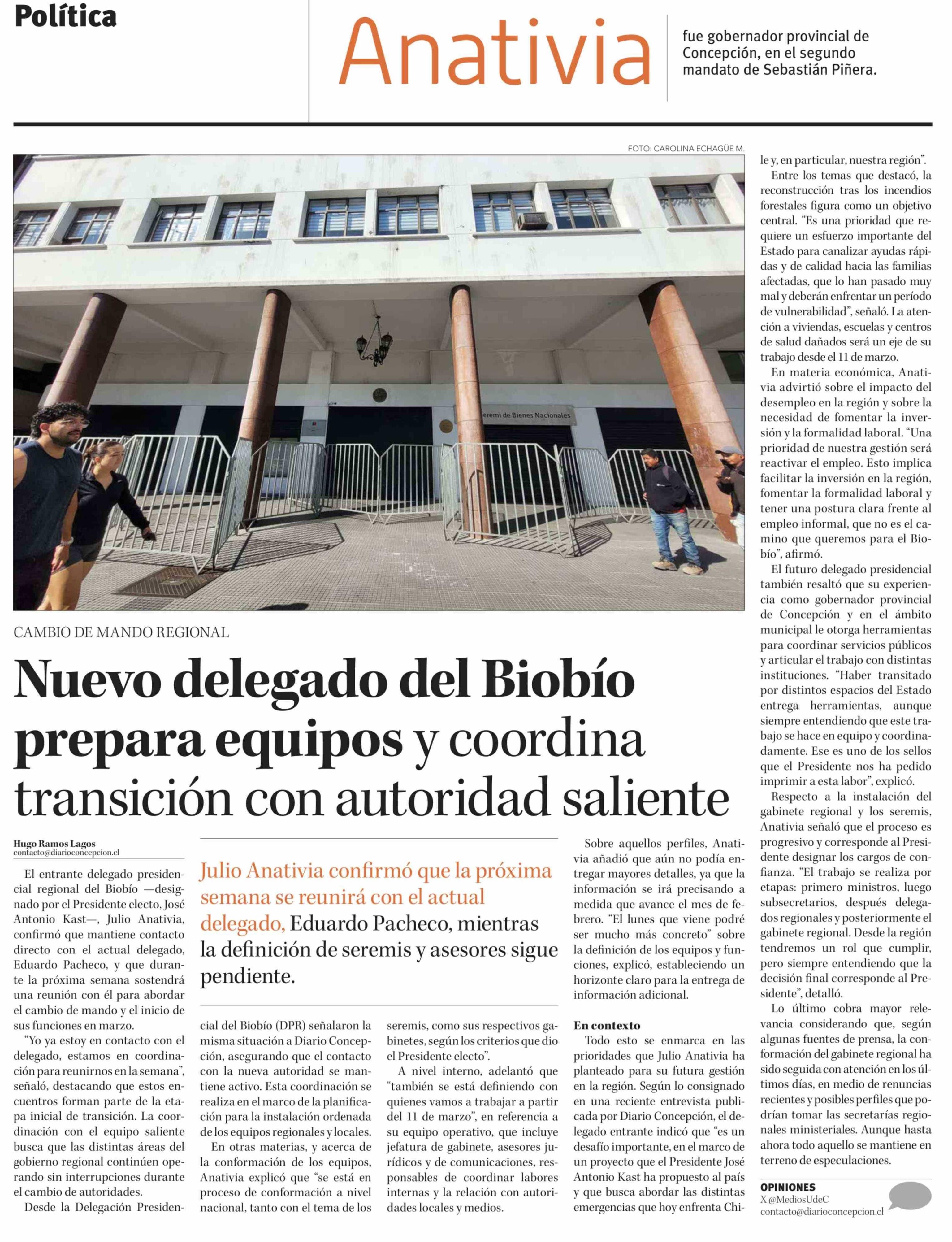 Nuevo delegado del Biobío prepara equipos y coordina transición con autoridad saliente 22-02-2026 Diario Concepción |