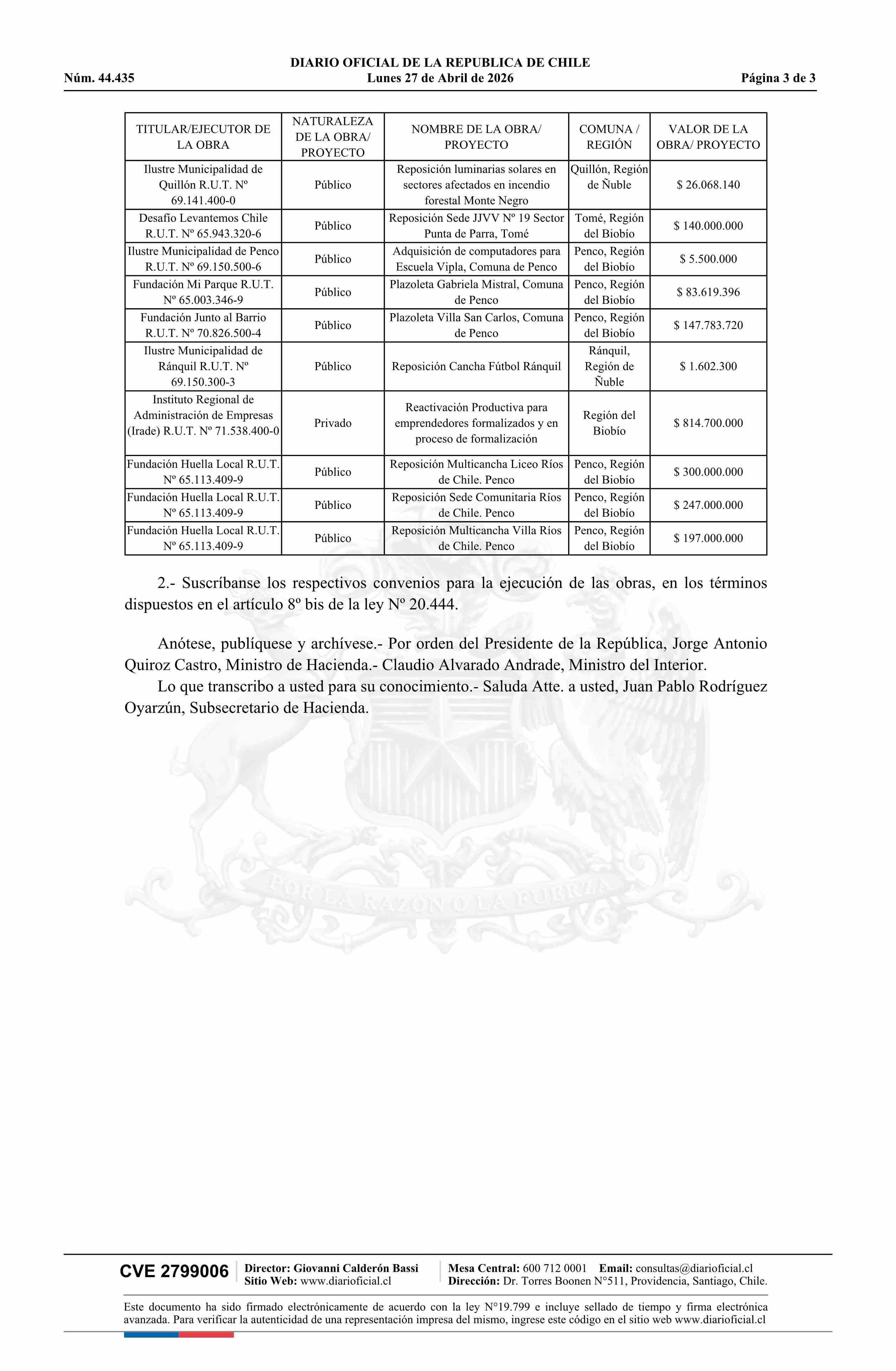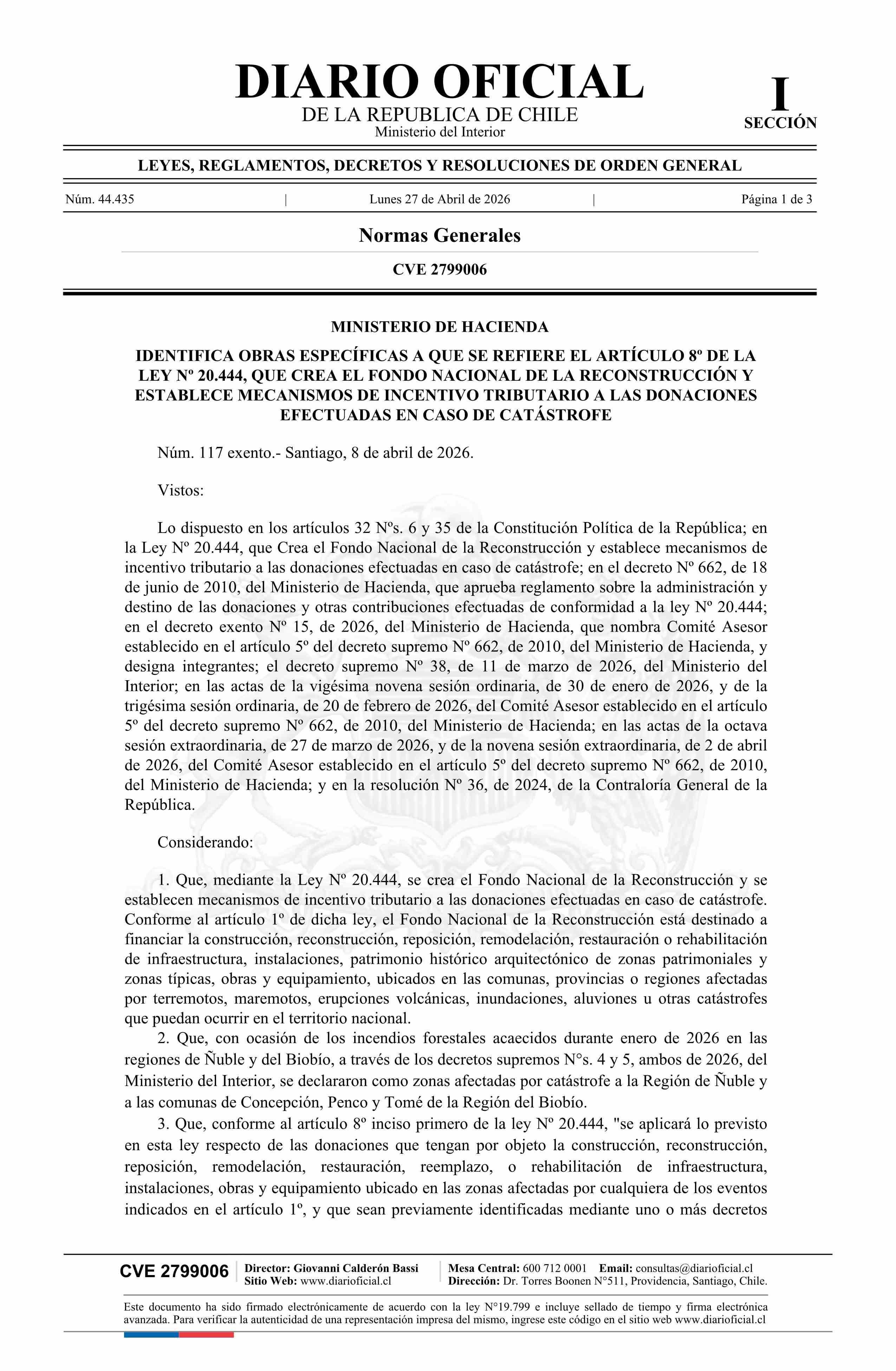 Título: Decreto exento número 117, de 2026.- Identifica obras específicas a que se refiere el artículo 8º de la Ley Nº 20.444, que crea el Fondo Nacional de la Reconstrucción y establece mecanismos de incentivo tributario a las donaciones efectuadas en caso de catástrofe