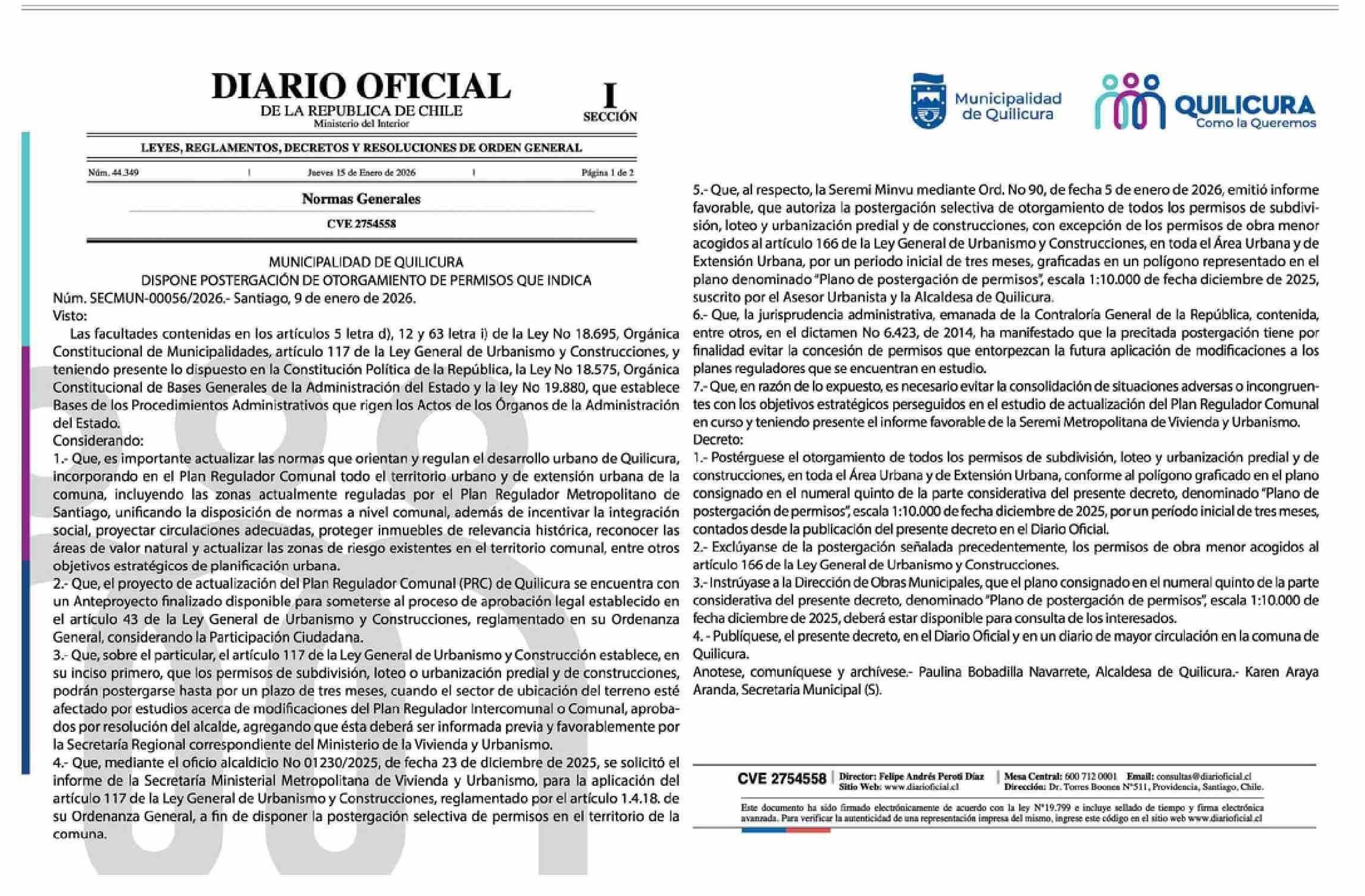 | Título: | Extractos: I Municipalidad DE LA REPUBLICA DE CHILE Ministerio del Interior de Quilicura SECCIÓN Como la Queremos LEYES, REGLAMENTOS, DECRETOS Y RESOLUCIONES DE ORDEN GENERAL Núm, 44.349 1 Jueves 15 de Enero de 2026 Página 1 de 2 Normas Generales CVE 2754558 5 .- Que, al respecto, la Seremi Minvu me |