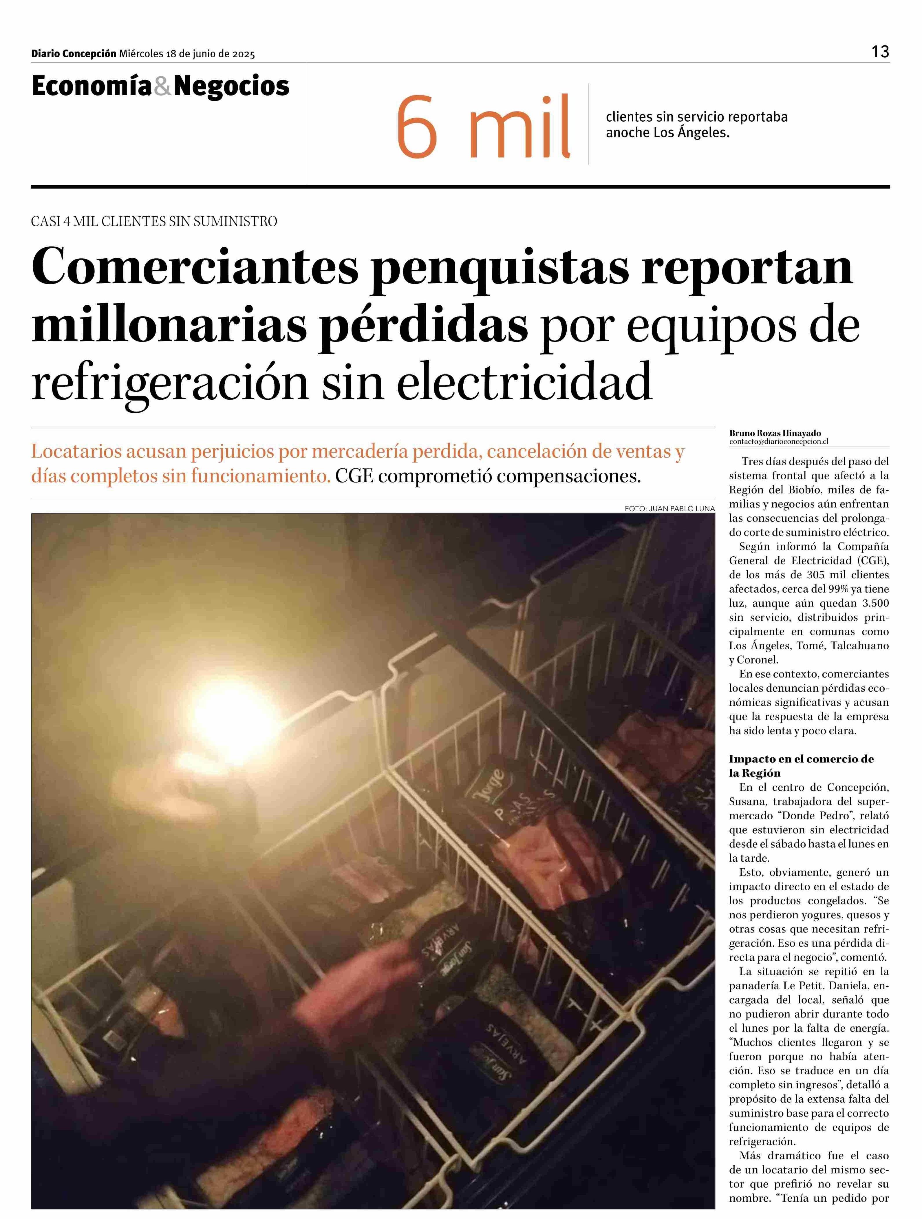 Comerciantes penquistas reportan millonarias pérdidas por equipos de refrigeración sin electricidad 18-06-2025 Diario Concepción |
