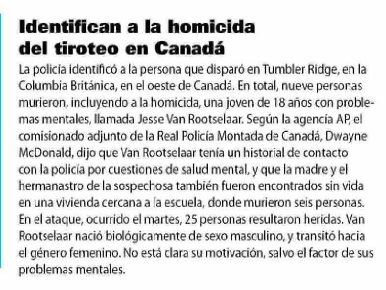 Identifican a la homicida del tiroteo en Canadá 13-02-2026 Las Últimas Noticias |