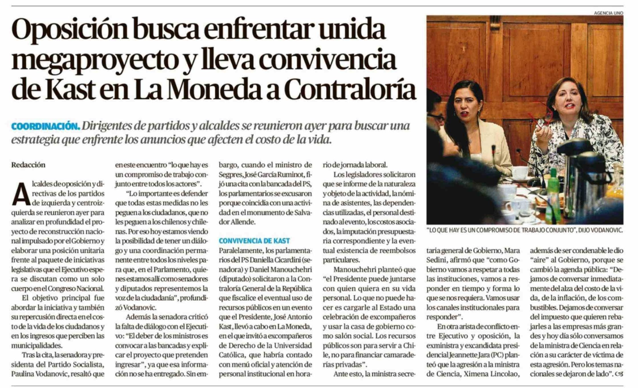 | Título: | Oposición busca enfrentar unida megaproyecto y lleva convivencia de Kast en La Moneda a Contraloría |
