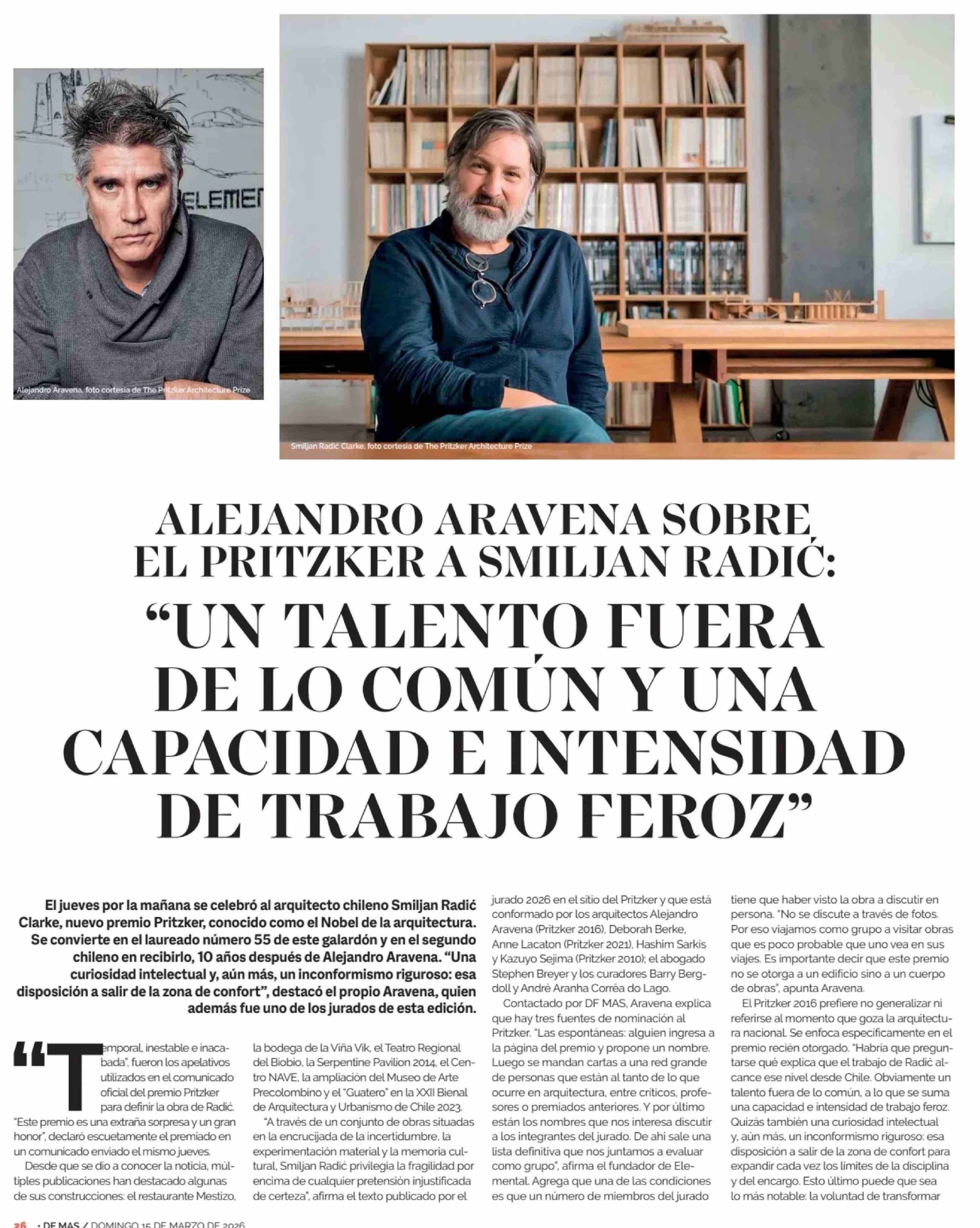 Título: ALEJANDRO ARAVENA SOBRE EL PRITZKER A SMILJAN RADIC: "UN TALENTO FUERA DE LO COMÚN Y UNA CAPACIDAD E INTENSIDAD DE TRABAJO FEROZ"