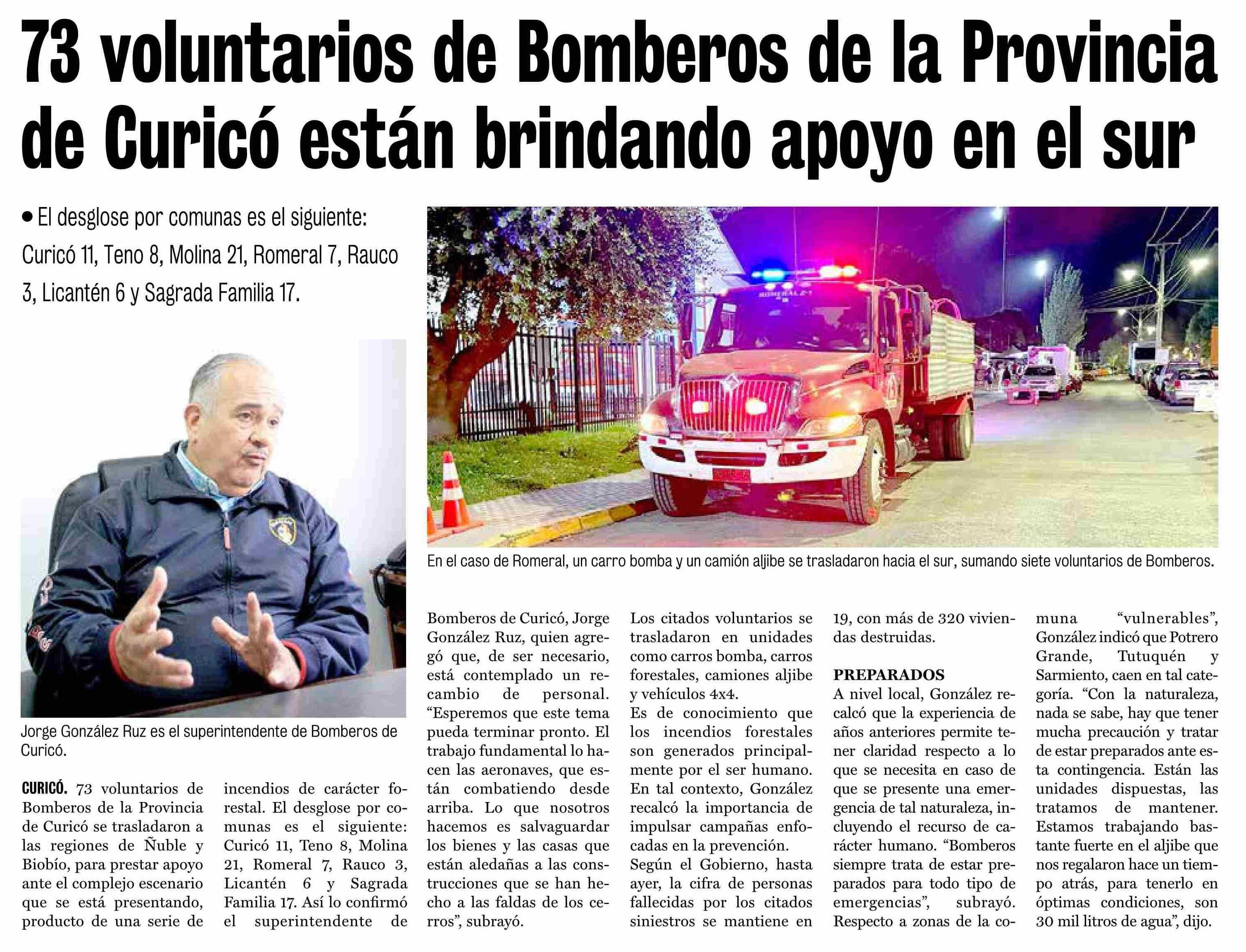 Título: 73 Voluntarios de Bomberos de la Provincia de Curicó estan brindando apoyo en el sur