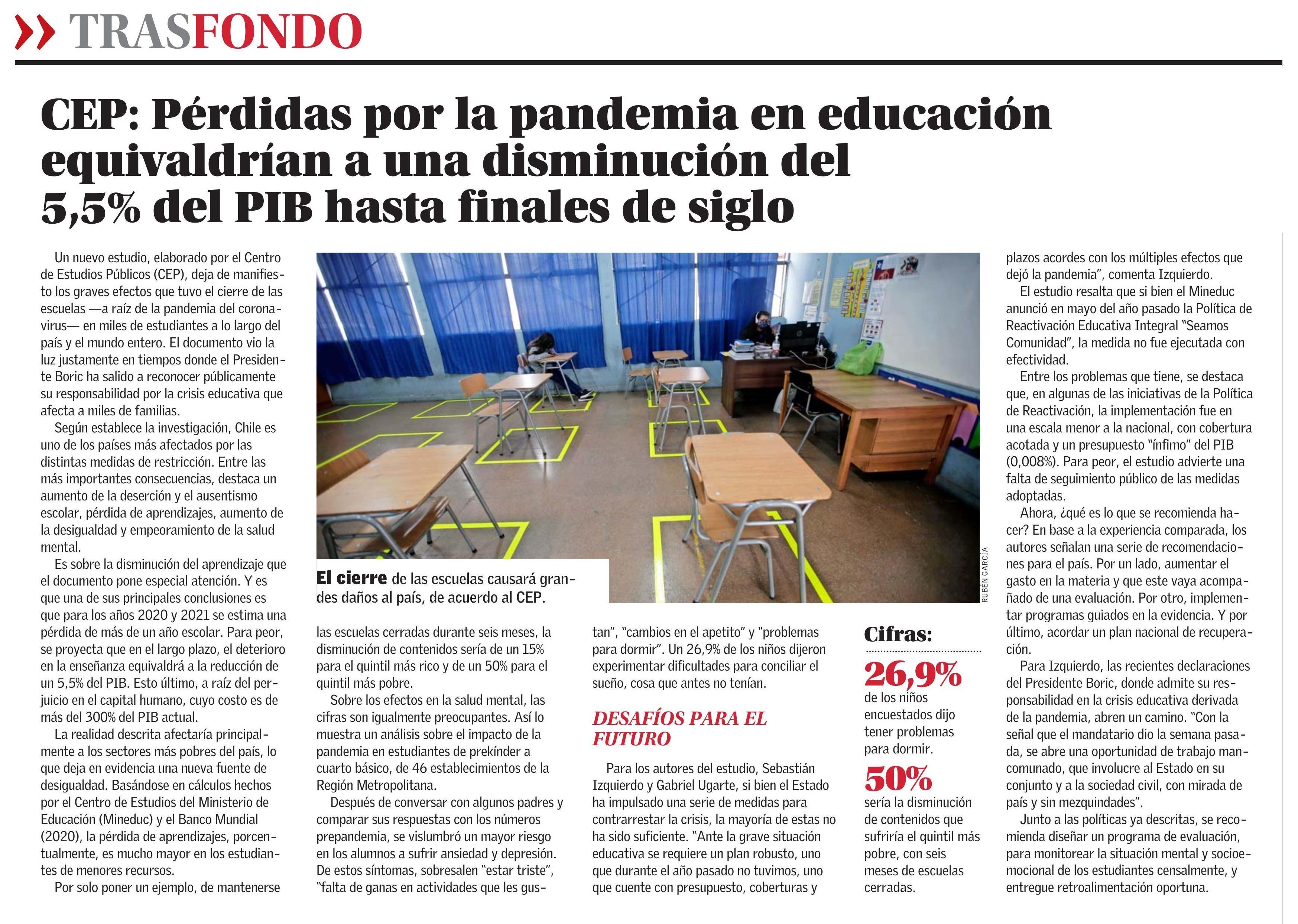 CEP: Pérdidas por la pandemía en educación equivaldrían a una disminución del 5, 5% del PIB hasta finales de siglo 22-01-2023 El Mercurio |