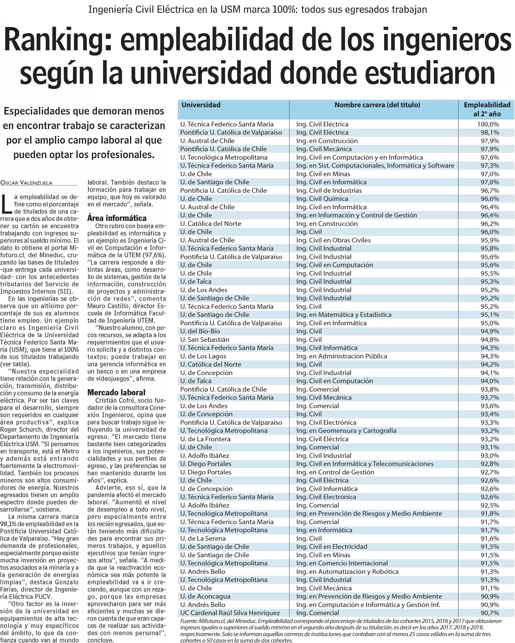 Ranking: empleabilidad de los ingenieros según la universidad donde estudiaron 15-05-2021 Las Últimas Noticias |