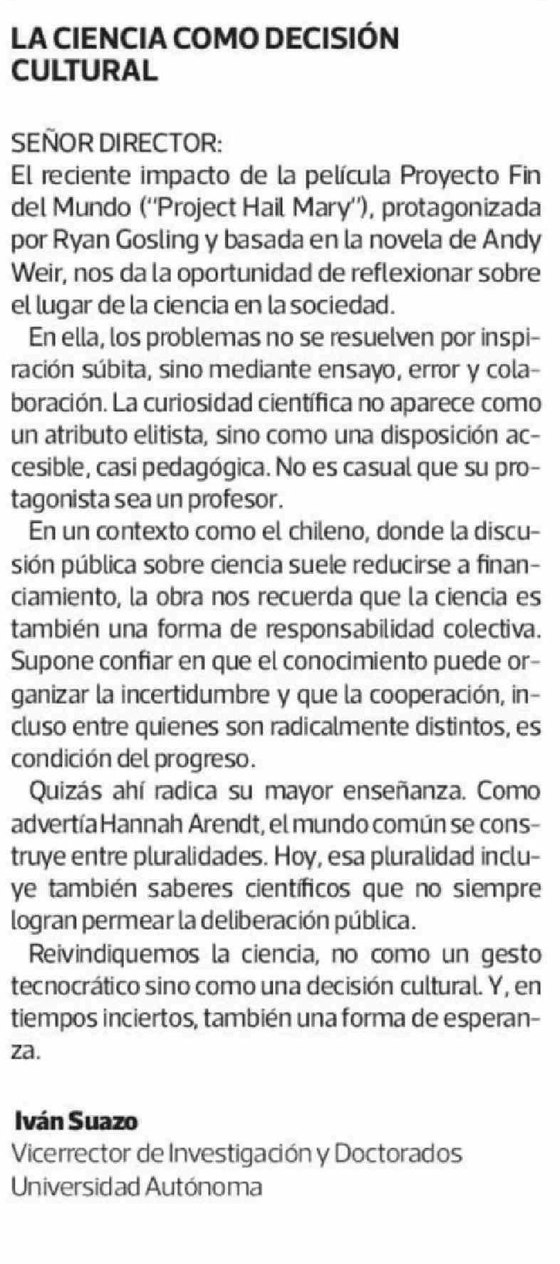 CARTAS: LA CIENCIA COMO DECISIÓN CULTURAL 21-04-2026 La Tercera |
