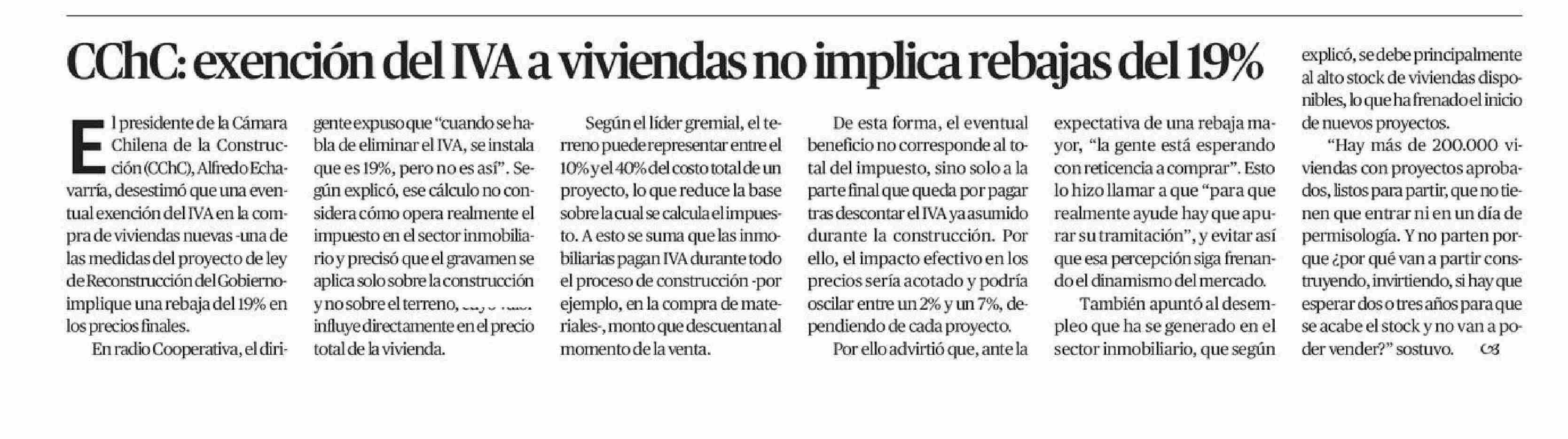 | Título: | CCHC: exención del IVA a viviendas no implica rebajas del 19% |