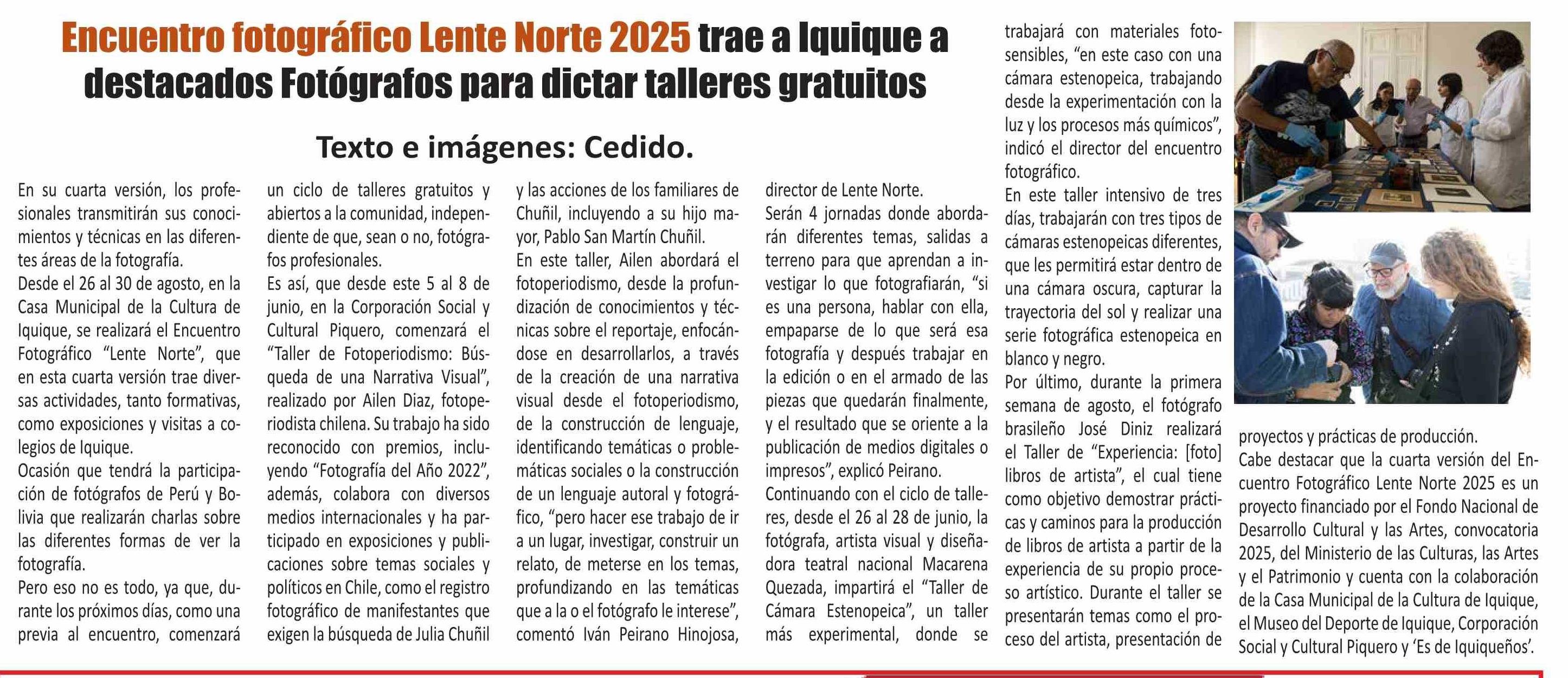 | Título: | En su cuarta versión, los profesionales transmitirán sus conocimientos y técnicas en las diferentes áreas de la fotografía. Desde el 26 al 30 de agosto, en la Casa Municipal de la Cultura de Iquique, se realizará el Encuentro Fotográfico “Lente Norte”, que en esta cuarta versión trae diversas activi |