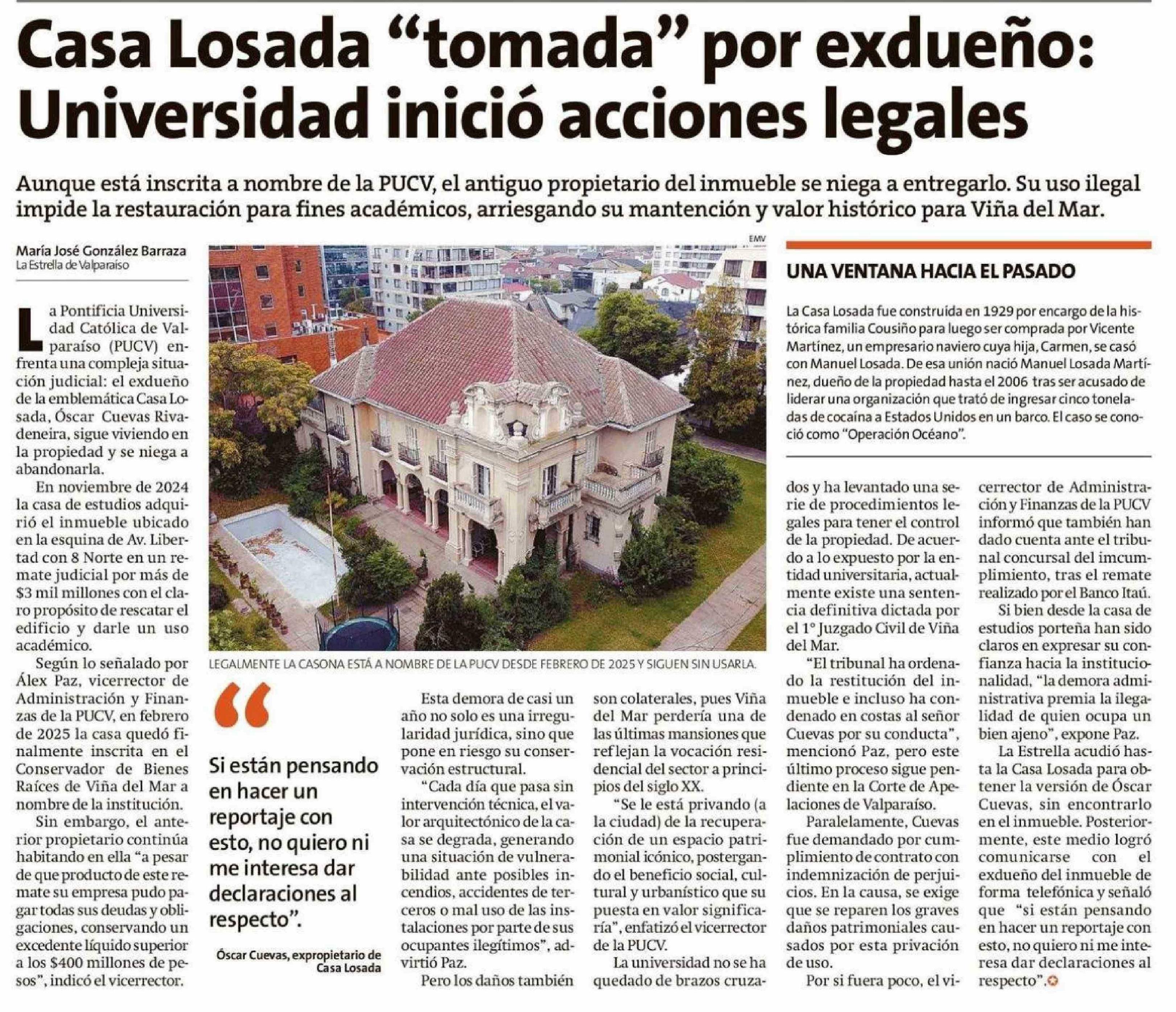Casa Losada "tomada" por exdueño: Universidad inició acciones legales 12-01-2026 La Estrella de Valparaíso |