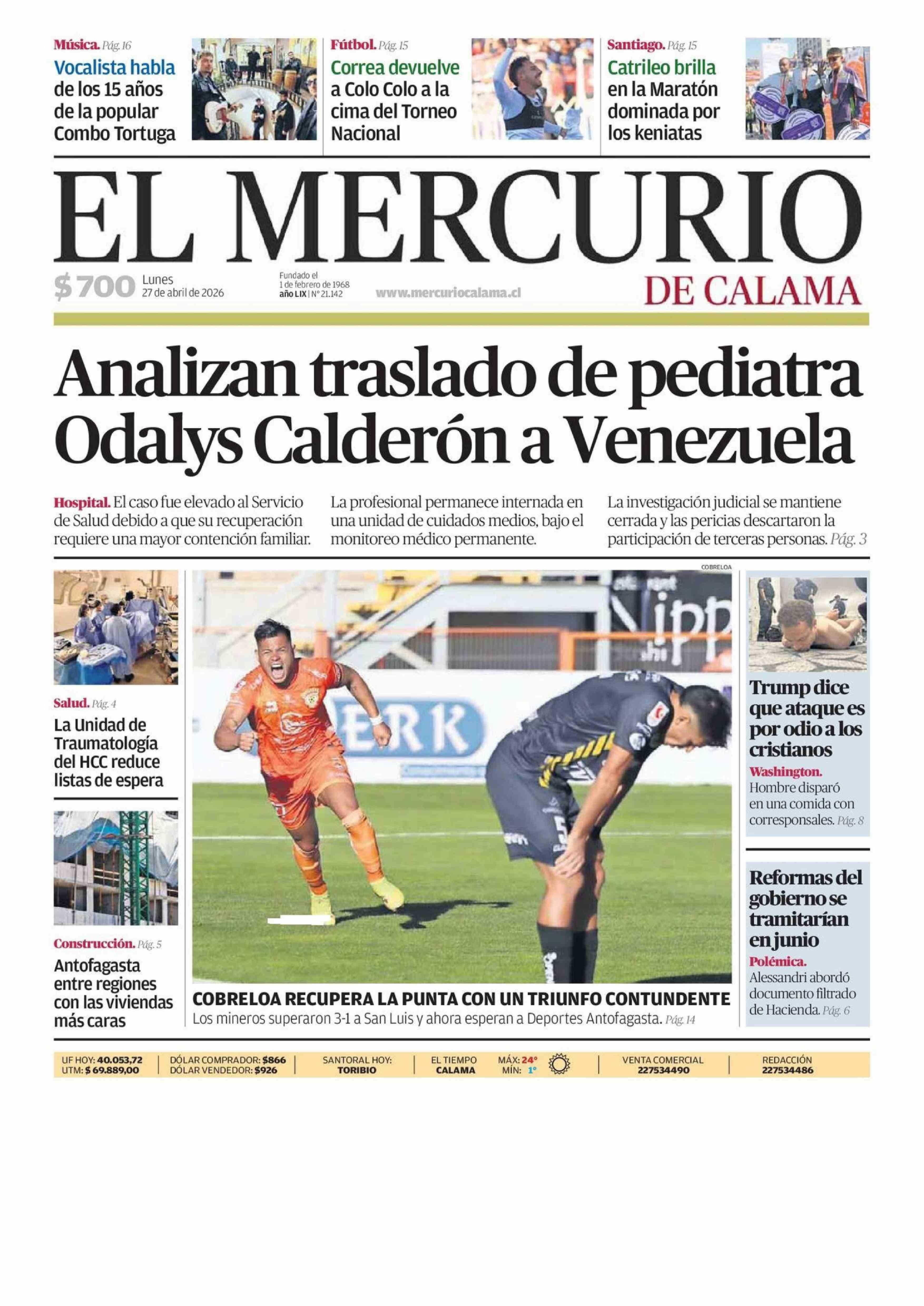 PORTADA EL MERCURIO DE CALAMA CHILE 27-04-2026 El Mercurio de Calama |