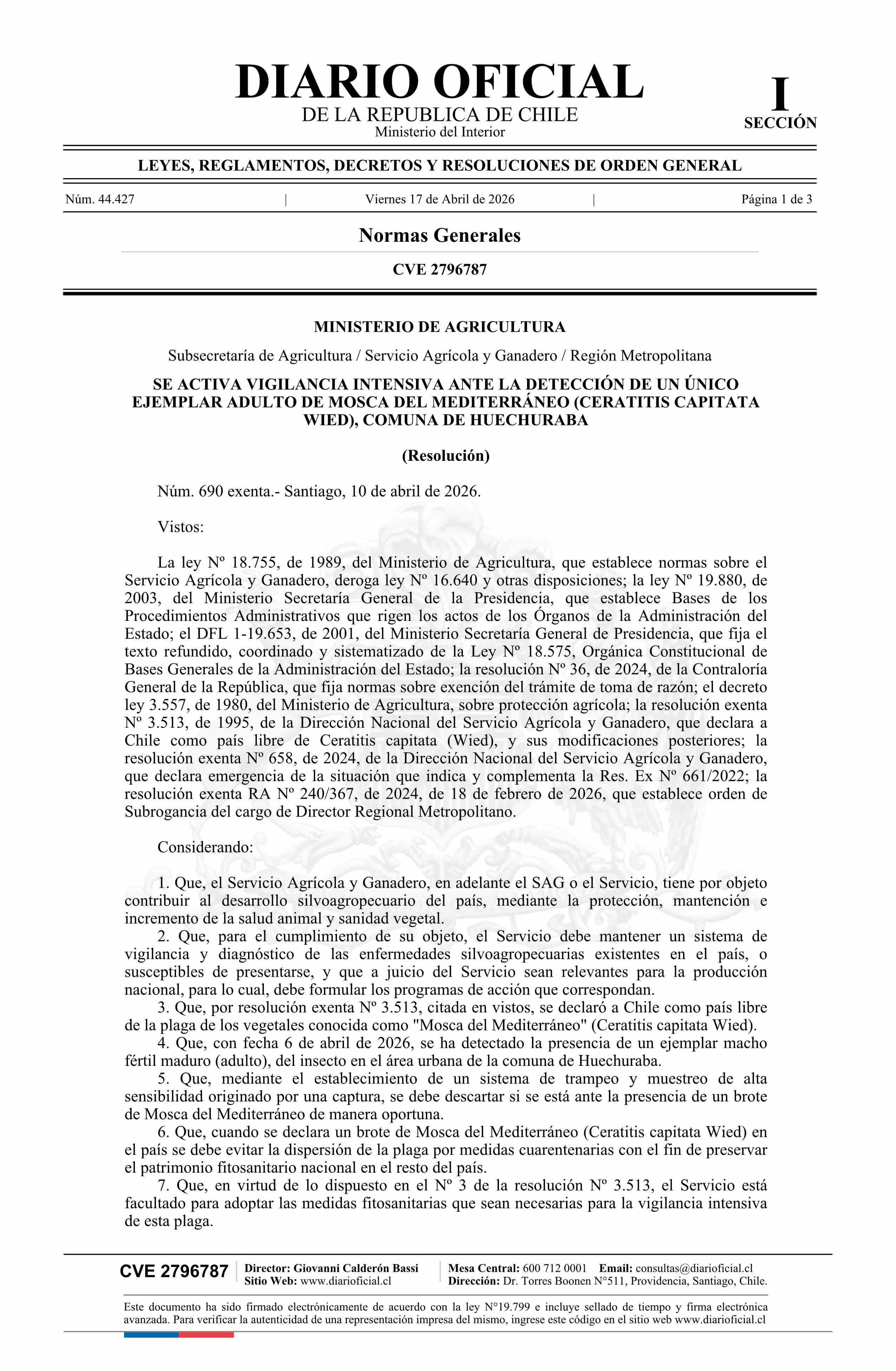 | Título: | Resolución exenta número 690, de 2026.- Activa vigilancia intensiva ante la detección de un único ejemplar adulto de Mosca del Mediterráneo (Ceratitis capitata Wied), comuna de Huechuraba |