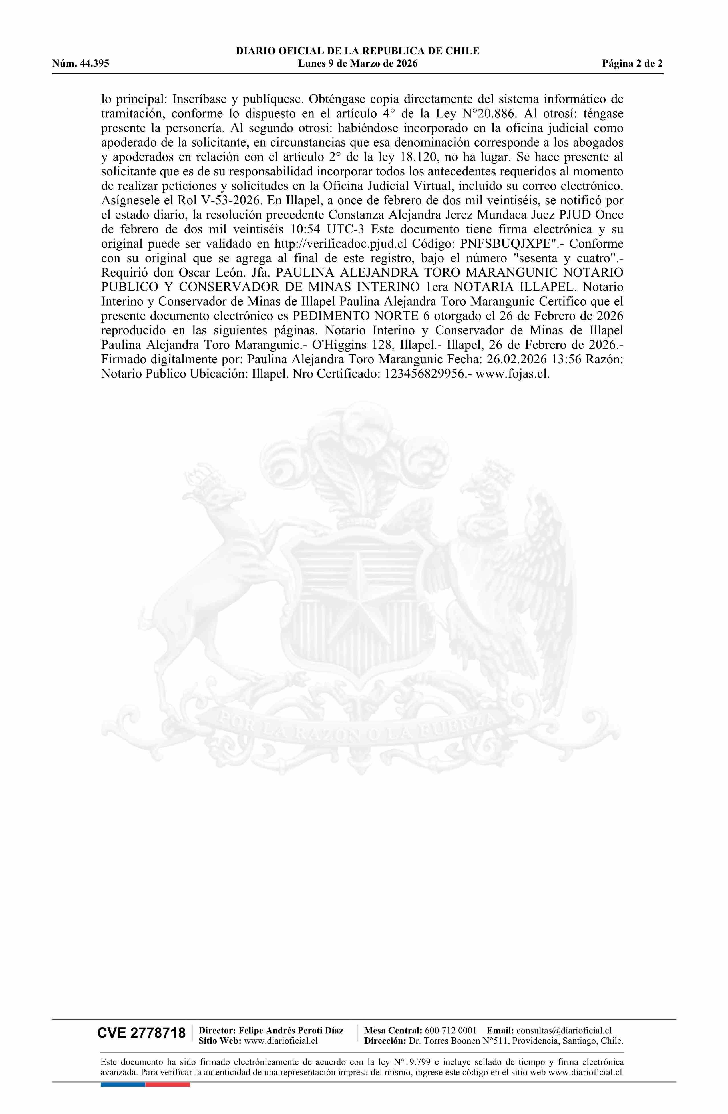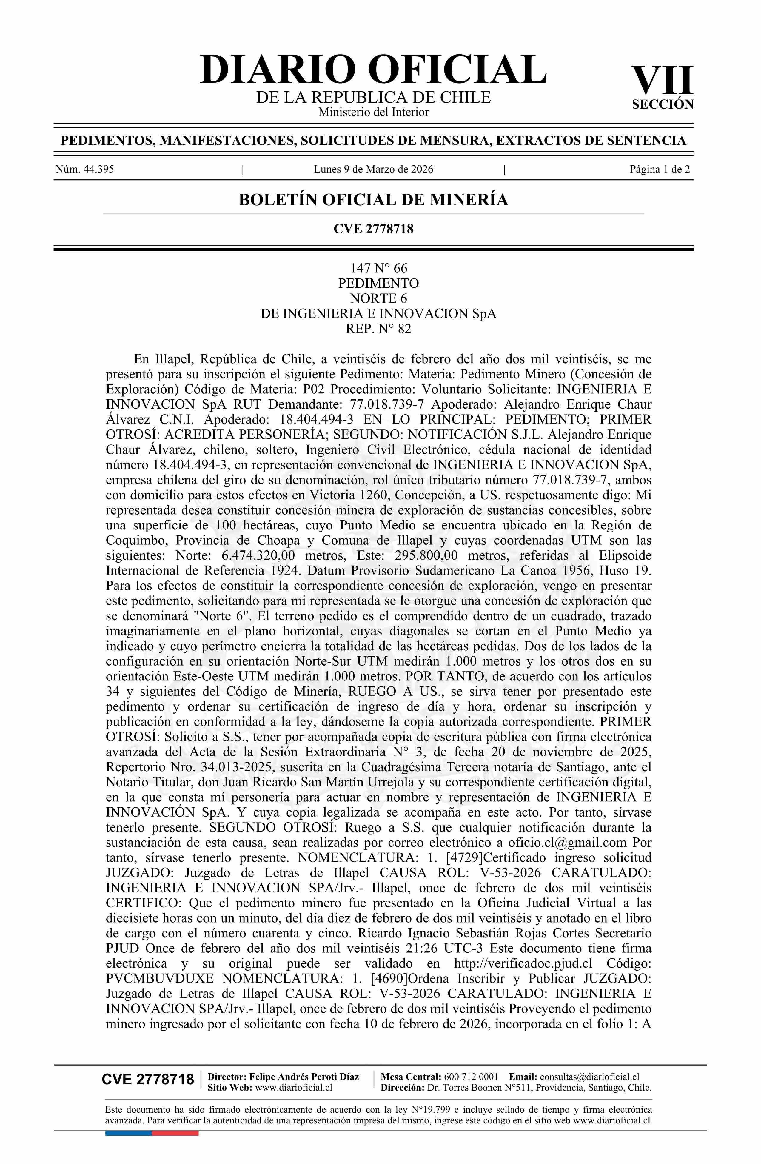 NORTE 6 / Ingeniería e Innovación SpA 09-03-2026 DIARIO OFICIAL CHILE - BOLETÍN OFICIAL DE MINERÍA |