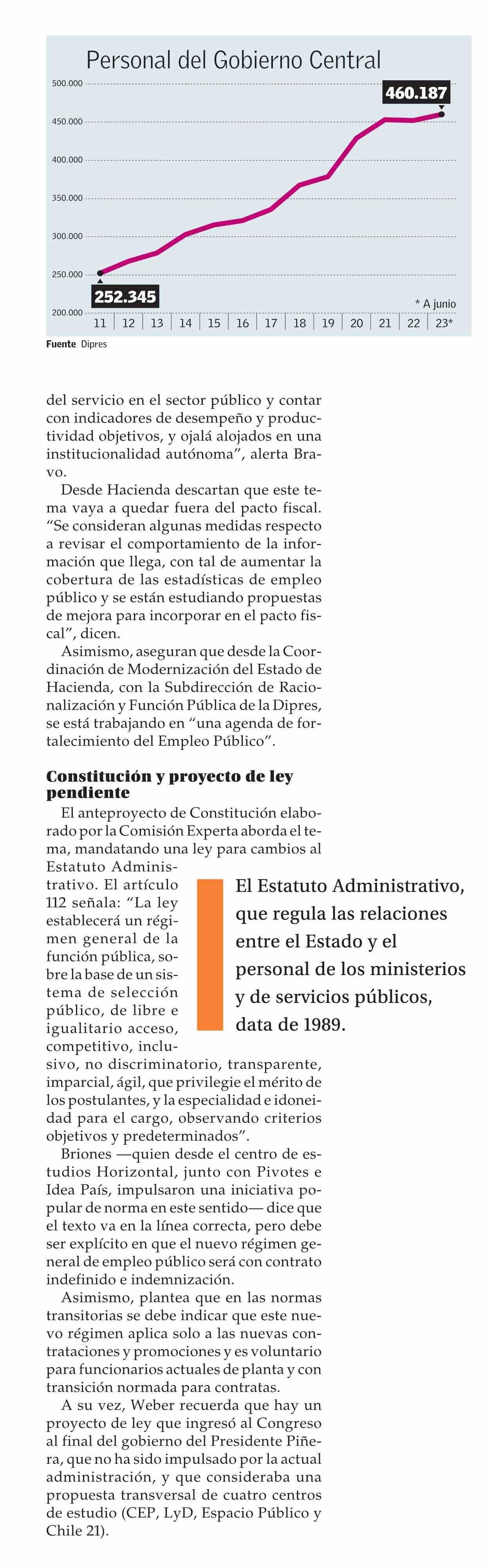 TRABAJADORES DEL SECTOR PÚBLICO CRECEN 70% en una década: expertos proponen modernizar estatuto administrativo 24-09-2023 El Mercurio |