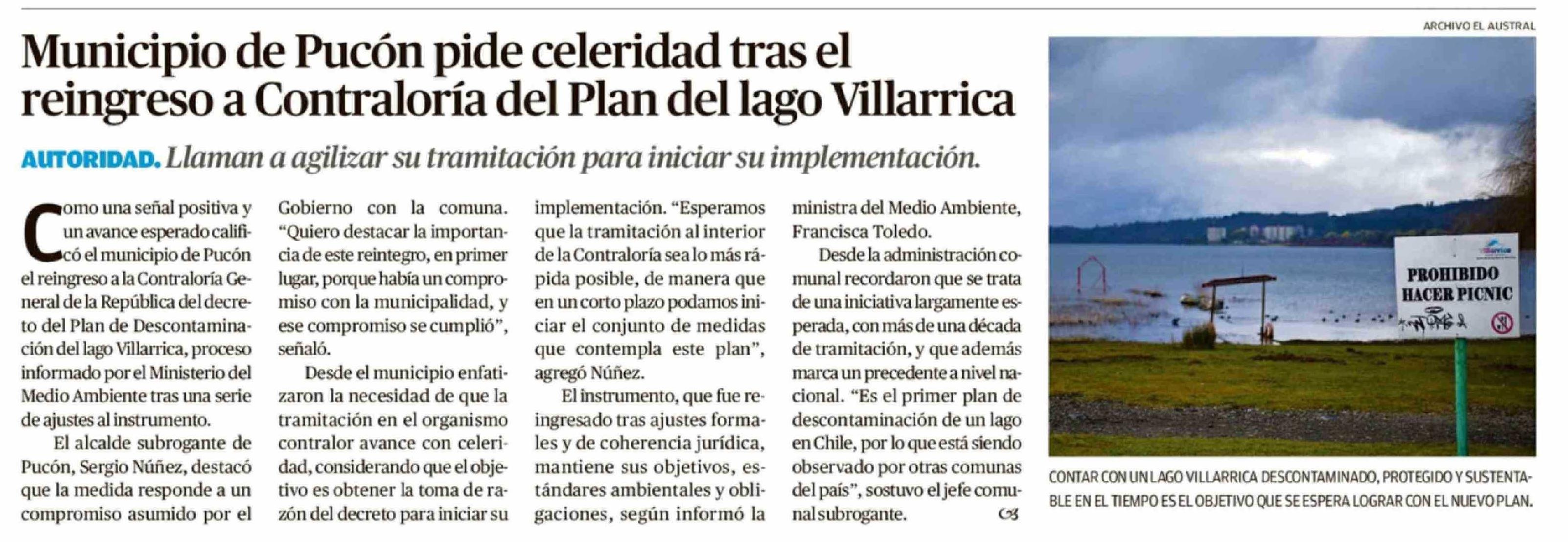 Título: Municipio de Pucón pide celeridad tras el reingreso a Contraloría del Plan del lago Villarrica