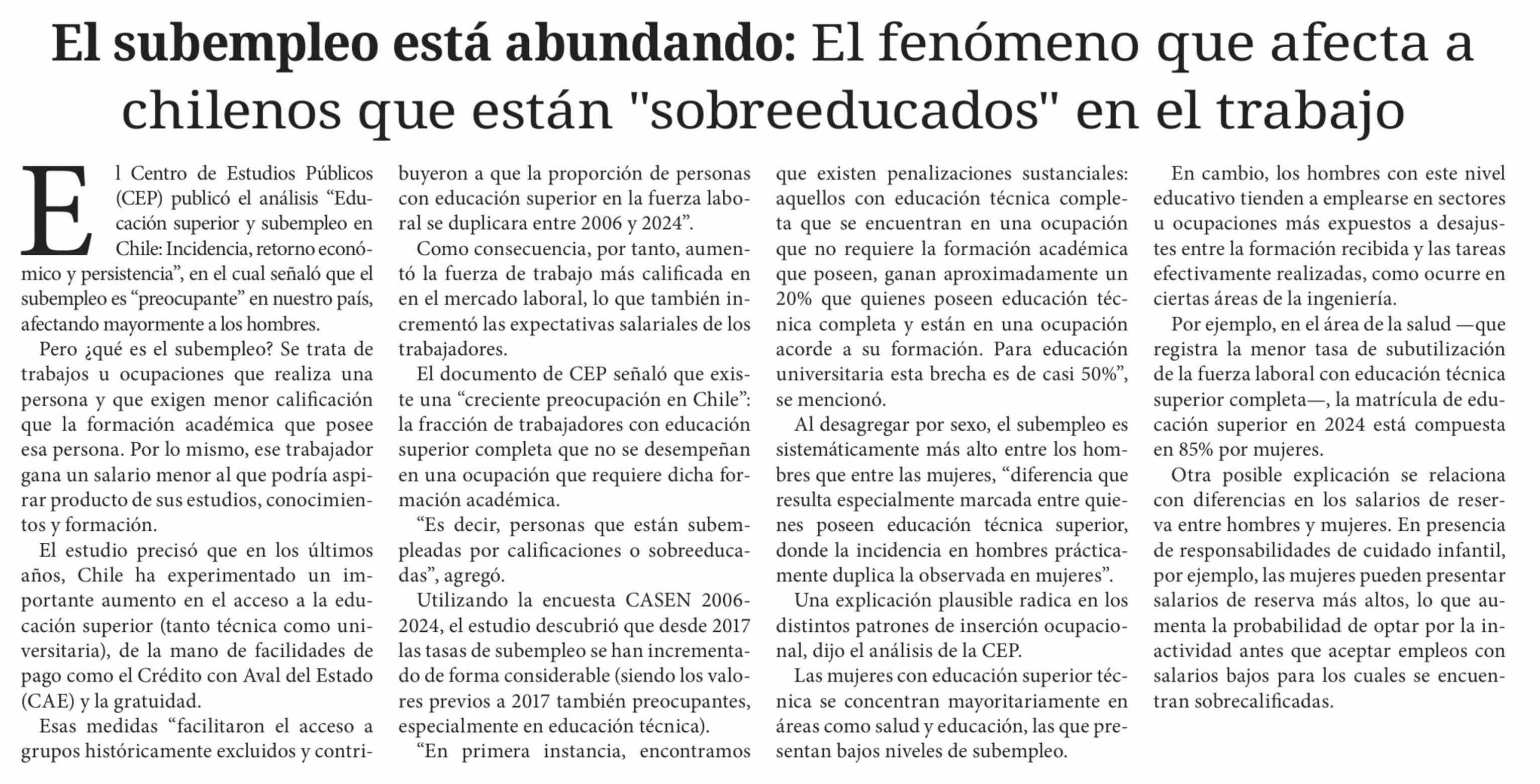 El subempleo está abundando: El fenómeno que afecta a chilenos que están "sobreeducados" en el trabajo 25-04-2026 Diario Chañarcillo |