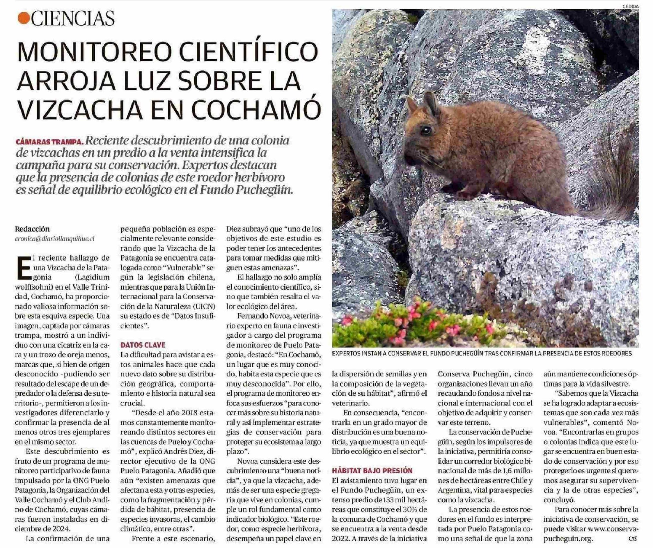 MONITOREO CIENTÍFICO ARROJA LUZ SOBRE LA VIZCACHA EN COCHAMÓ 06-06-2025 El Llanquihue |