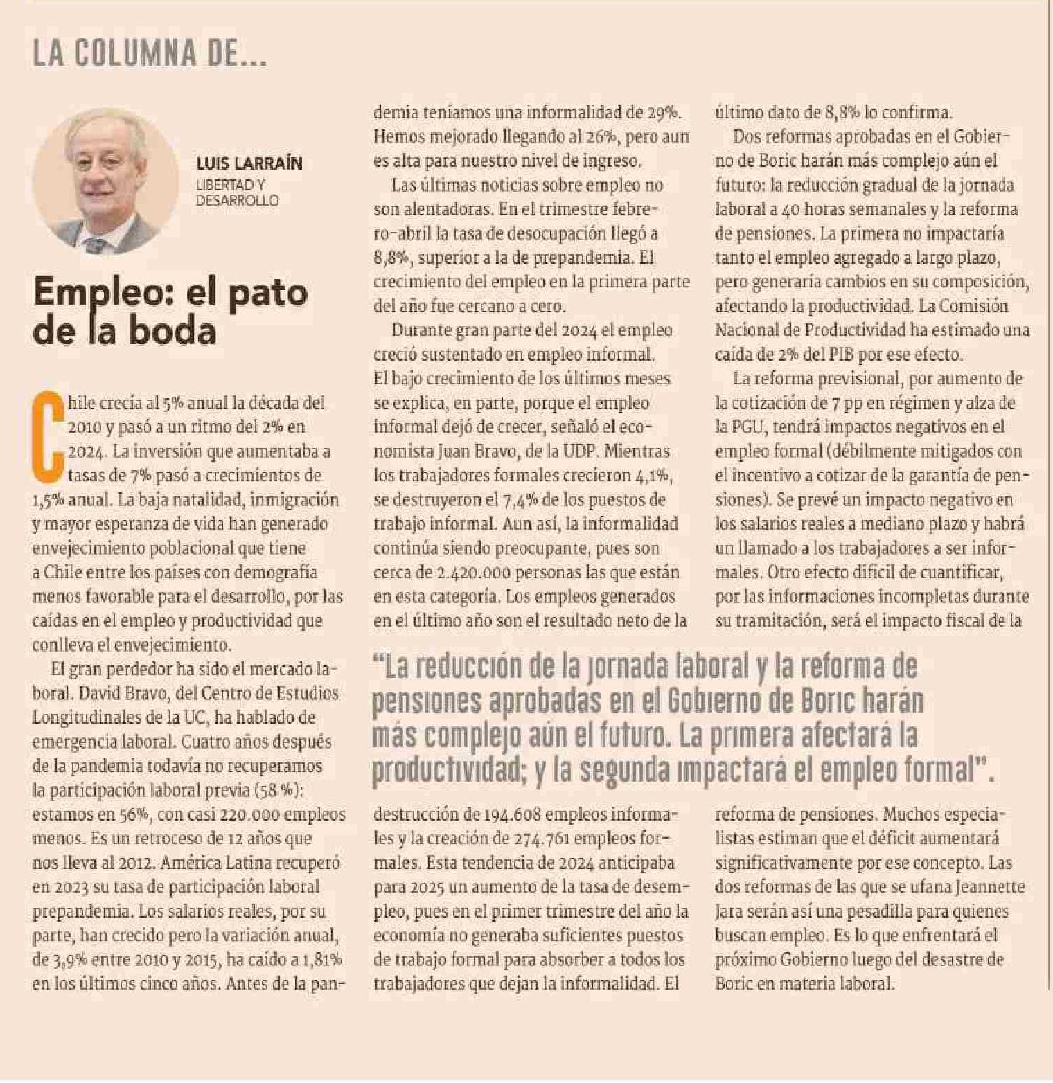 COLUMNAS DE OPINIÓN: Empleo: el pato de la boda 10-06-2025 Diario Financiero |