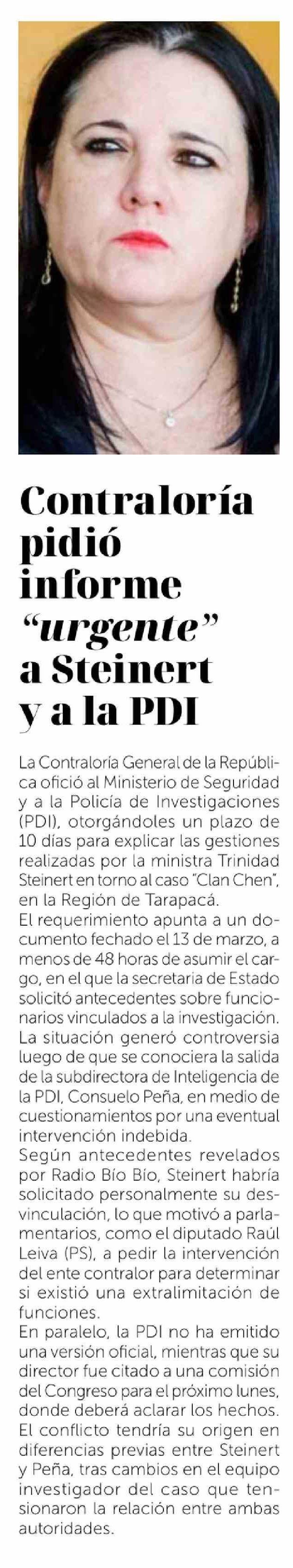 | Título: | Contraloría pidió informe "urgente" a Steinert y a la PDI |