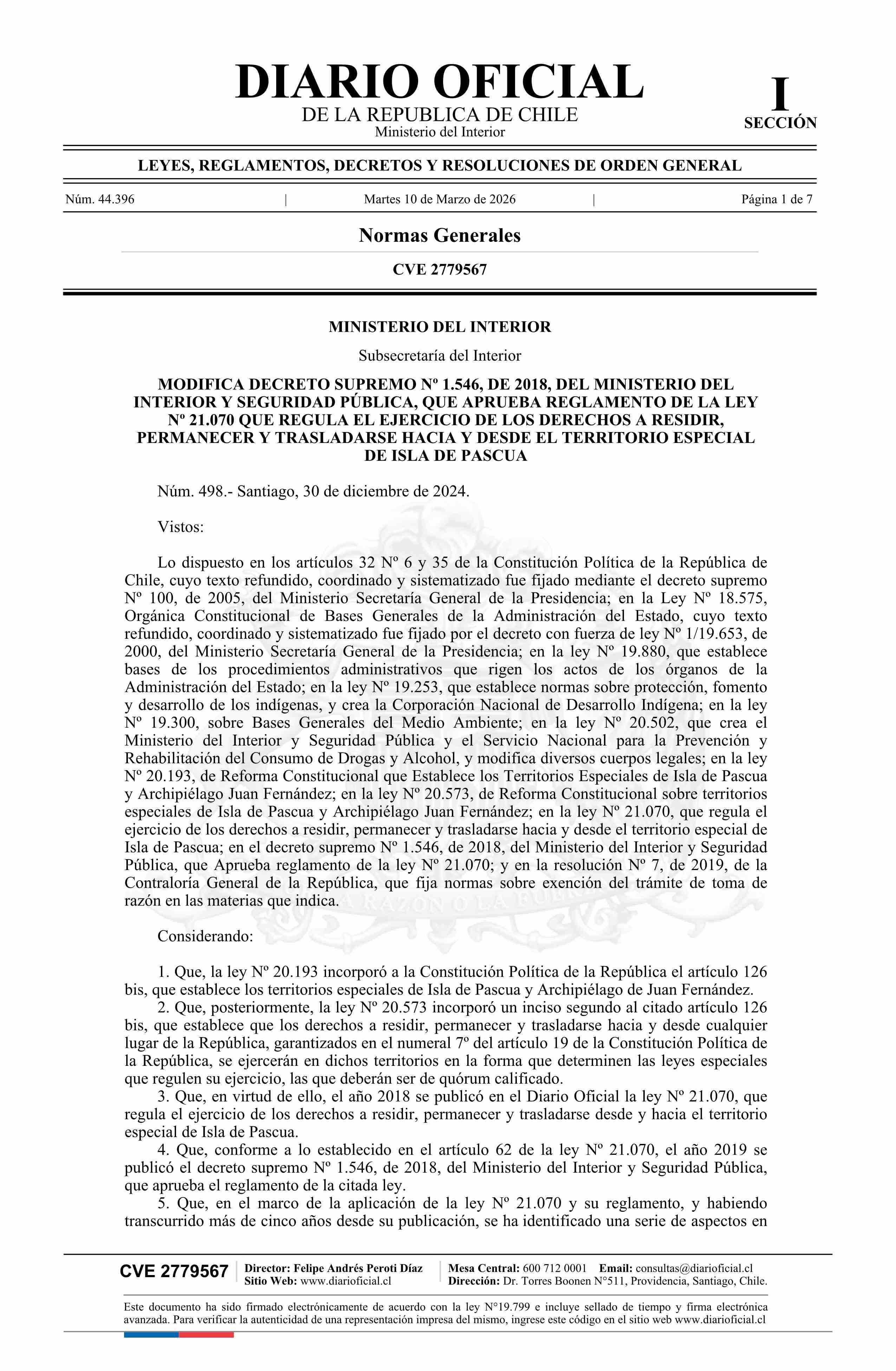 Título: Decreto número 498, de 2024.- Modifica decreto Nº 1.546, de 2018, que aprueba reglamento de la ley Nº 21.070 que regula el ejercicio de los derechos a residir, permanecer y trasladarse hacia y desde el territorio especial de Isla de Pascua