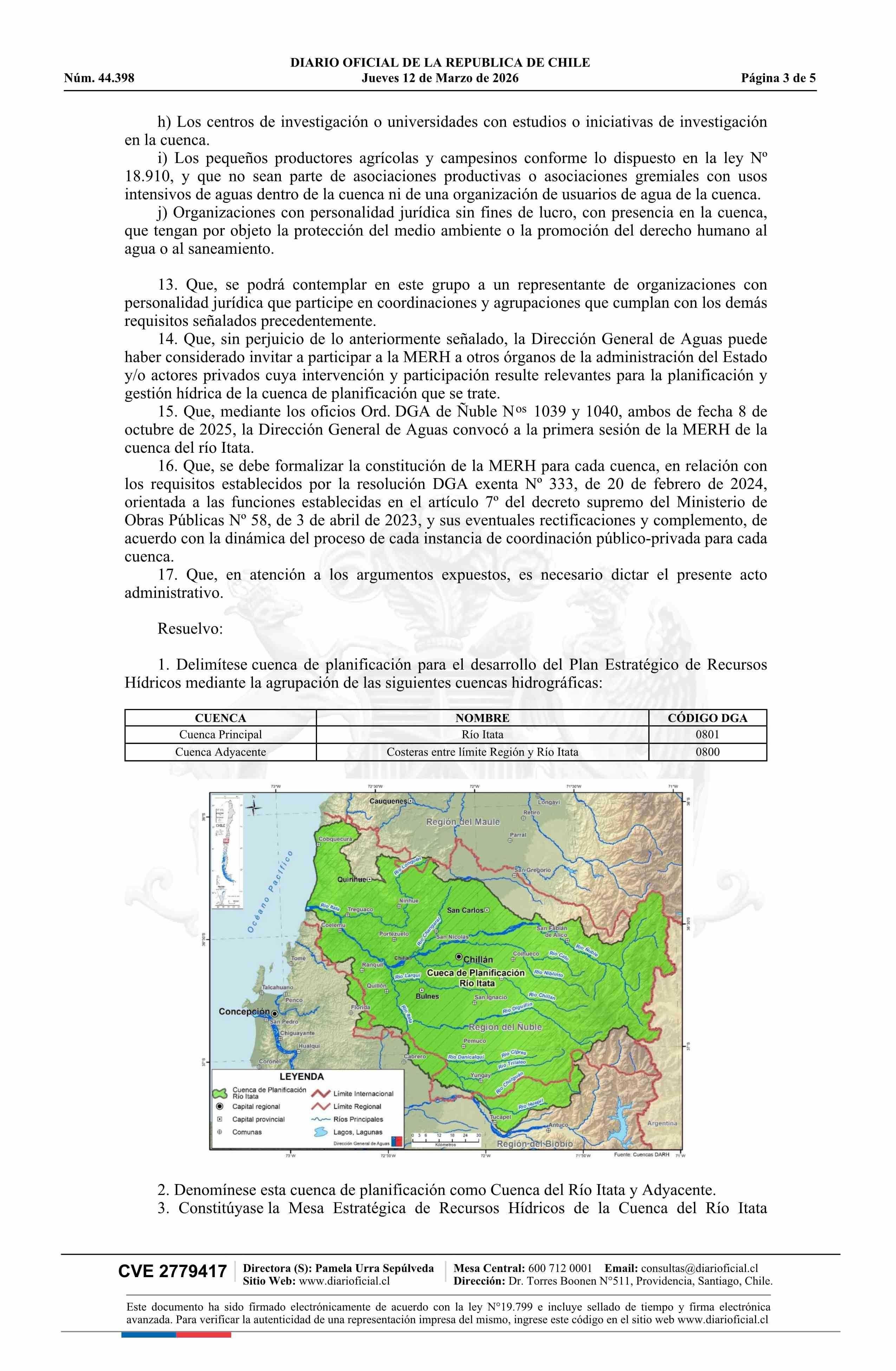 Resolución exenta número 485, de 2026.- Delimita y denomina cuenca de planificación para el desarrollo del Plan Estratégico de Recursos Hídricos en la Cuenca del Río Itata y Adyacente; constituye mesa estratégica de recursos hídricos; identifica convocados y asistencia a primera sesión; y designa de