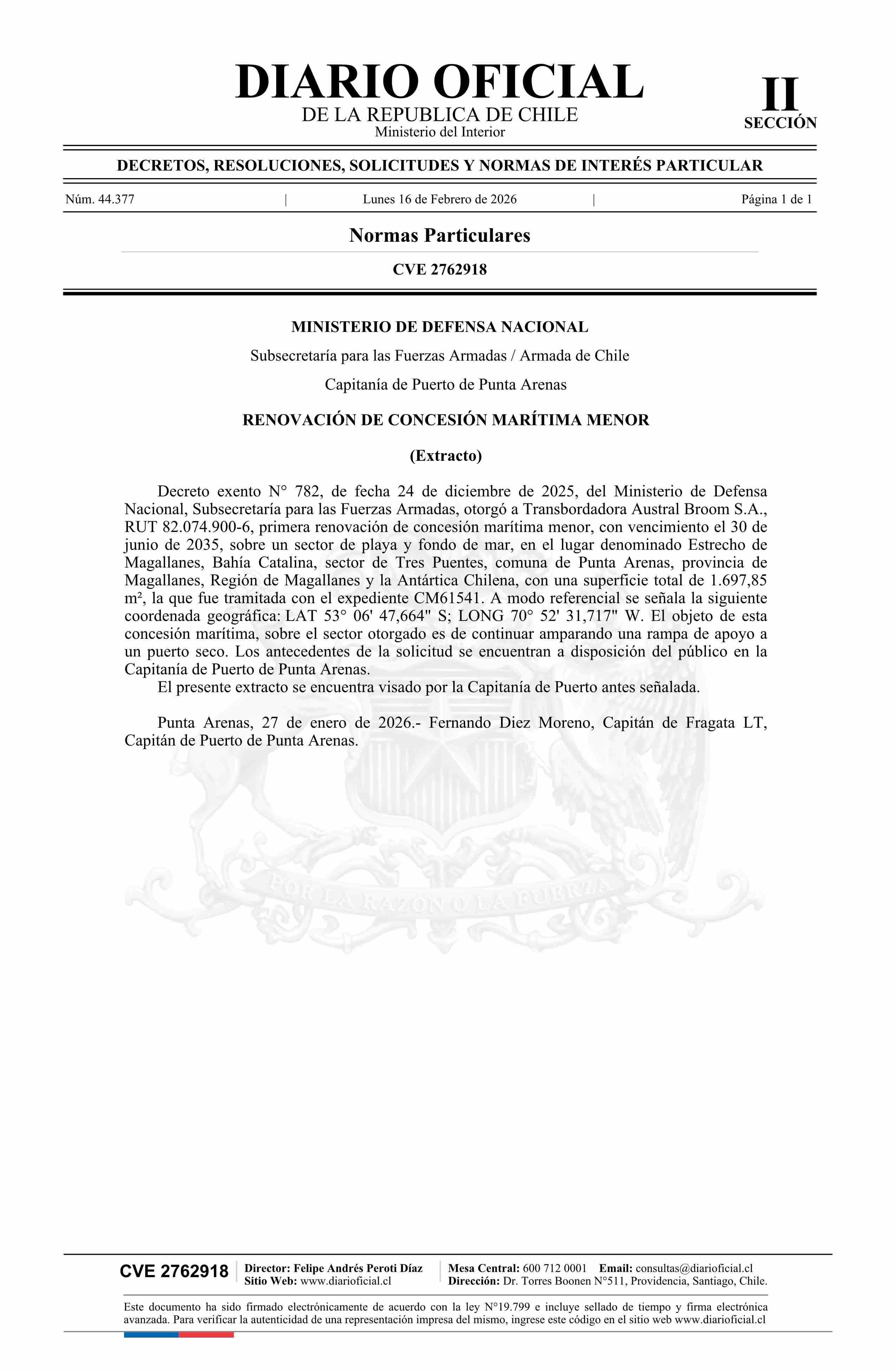 Extracto de decreto exento número 782, de 2025.- Renovación de concesión marítima menor 16-02-2026 Diario Oficial Edición Electrónica |