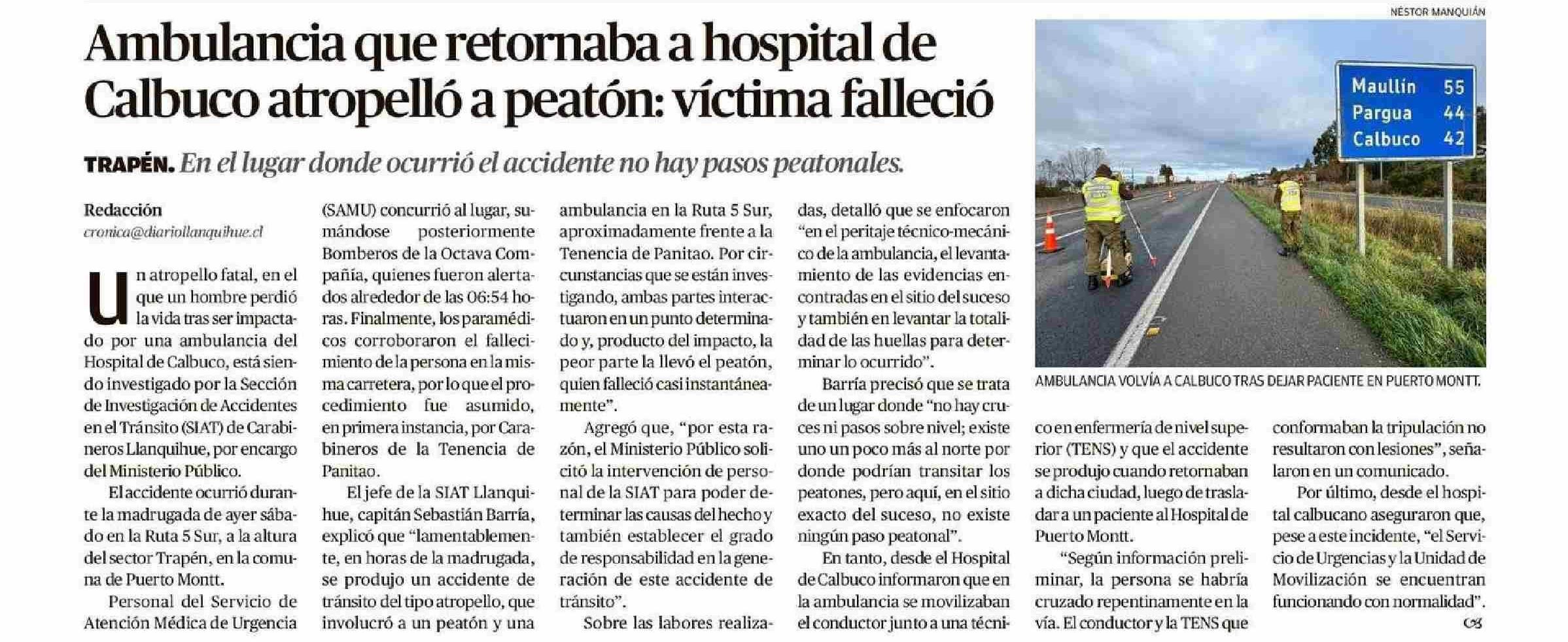 Ambulancia que retornaba a hospital de Calbuco atropelló a peatón: víctima falleció 01-06-2025 El Llanquihue |