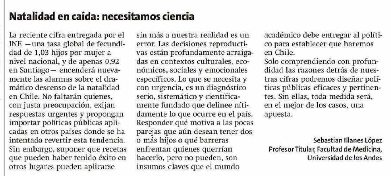 Cartas: Natalidad en caída: necesitamos ciencia 31-05-2025 La Estrella de Valparaíso |